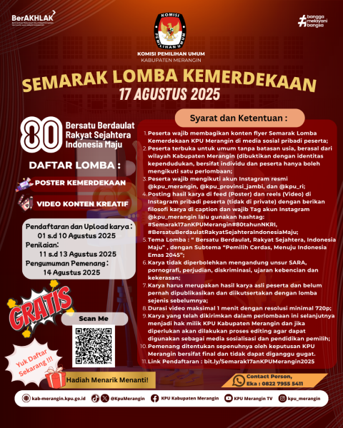 Halo #TemanPemilih, Menyemarakkan HUT Kemerdekaan RI Ke-80, Komisi Pemilihan Umum Kabupaten Merangin mengadakan Lomba membuat Poster Kemerdekaan dan Video Konten Kreatif.