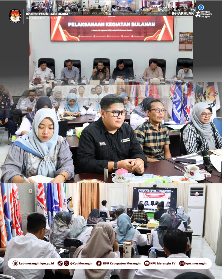 Halo #TemanPemilih Kamis (28/8), Komisi Pemilihan Umum Kabupaten Merangin mengikuti Rapat Koordinasi Pelaksanaan Kegiatan Bulanan bersama KPU Kabupaten/Kota se-Provinsi Jambi.