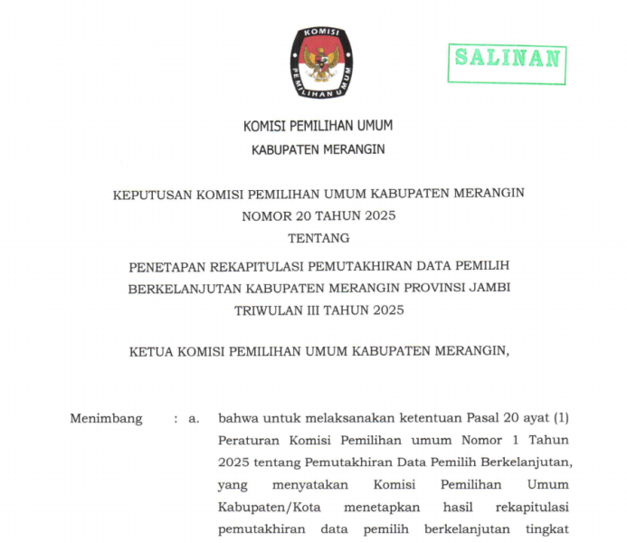 Keputusan KPU Kabupaten Merangin tentang Penetapan Rekapitulasi Pemutakhiran Data Pemilih Berkelanjutan Kabupaten Merangin Triwulan III Tahun 2025