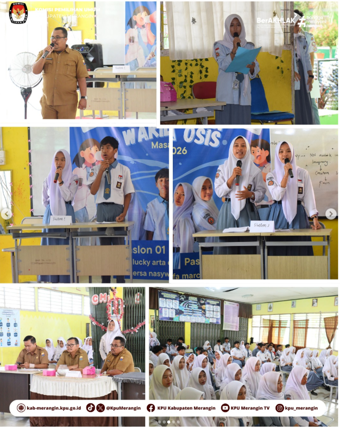 Bangko, KPU Kabupaten Merangin menghadiri kehiatan Debat Pemilihan Calon Ketua dan Wakil Ketua OSIS SMA Negeri 1 Merangin. Pada hari Senin, 20 Oktober 2025, dilaksanakan di Aula Sekolah SMA Negeri 1 Merangin.