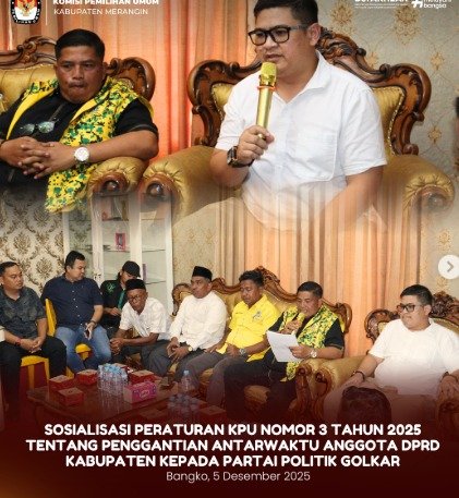 Bangko, Komisi Pemilihan Umum Kabupaten Merangin menyampaikan Sosialisasi PKPU Nomor 3 Tahun 2025 tentang Penggantian Antarwaktu Anggota DPR, DPD, DPRD Provinsi dan DPRD Kabupaten/Kota, bersama Partai Golongan Karya (Golkar) tingkat Kabupaten pada Jum’at, 5 Desember 2025 bertempat di Kantor parpol PPK Kabuapten Merangin.