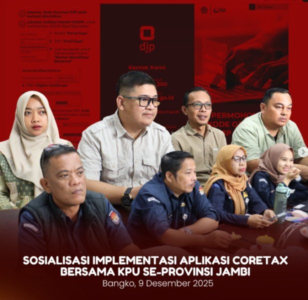 KPU Kabupaten Merangin mengikuti Kegiatan Sosialisasi Implementasi Aplikasi Coretax terkait Aktivasi Akun dan Pelaporan SPT Tahunan yang diselenggarakan oleh KPU Provinsi Jambi secara daring, pada Selasa (9/12/2025).