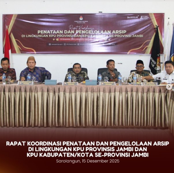 Bangko, Ketua KPU Kabupaten Merangin, Sekretaris beserta Kasubbag Keuangan, Umum dan Logistik KPU Kabupaten Merangin, menghadiri kegiatan Pengelolaan dan Penyelamatan Arsip di Lingkungan KPU Provinsi dan KPU kabupaten/Kota , bertempat di Aula Kantor KPU Kabupaten Sarolangun. Senin, 15 Desember 2025.
