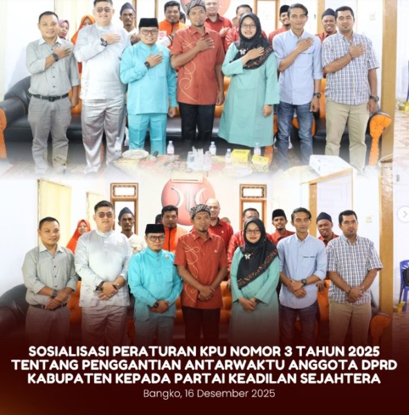 Bangko, Selasa (16/12), Komisi Pemilihan Umum Kabupaten Merangin menyampaikan Sosialisasi PKPU Nomor 3 Tahun 2025 tentang Penggantian Antarwaktu Anggota DPR, DPD, DPRD Provinsi dan DPRD Kabupaten/Kota serta Koordinasi Pemutakhiran Data Partai Politik Semester II Tahun 2025 bersama Partai Keadilan Sejahtera (PKS) tingkat Kabupaten, bertempat di Kantor Partai Keadilan Sejahtera (PKS) Kabupaten Merangin.
