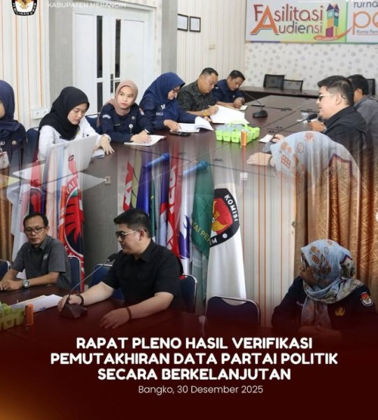 Bangko, KPU Kabupaten Merangin melaksanakan Rapat Pleno Hasil Verifikasi Pemutakhiran Data Partai Politik secara Berkelanjutan Semester II Tahun 2025 melalui Sistem Informasi Partai Politik (SIPOL) pada Selasa, 30 Desember 2025 bertempat di Aula Kantor KPU Kabupaten Merangin.