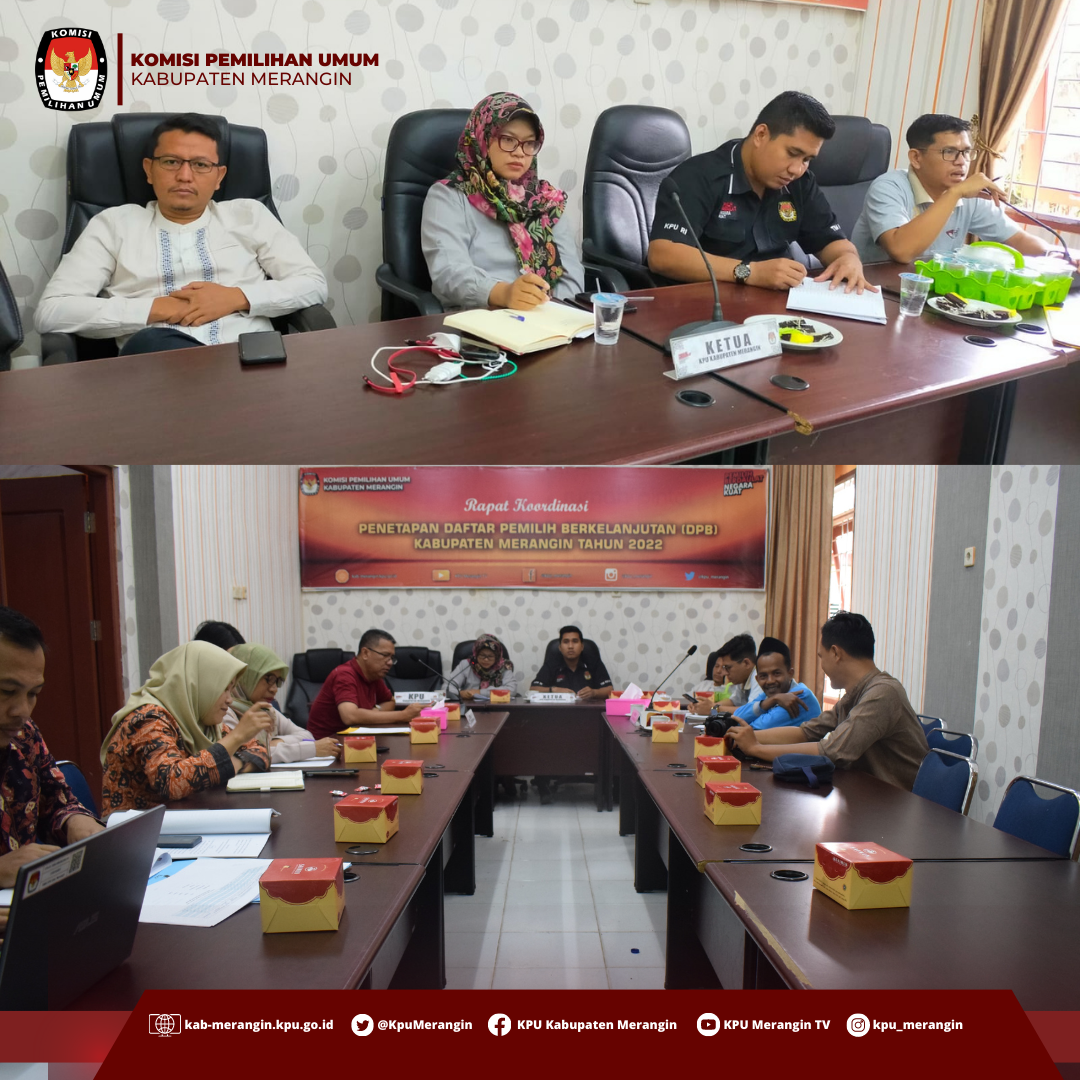 Bangko (30/09) Memasuki bulan kesepuluh tahun 2022, KPU Kabupaten Merangin kembali mengadakan rapat koordinasi penetapan Daftar Pemilih Berkelanjutan (DPB) periode bulan September 2022 Kabupaten Merangin dengan mengundang Bawaslu Kabupaten Merangin dan instansi terkait di aula kantor KPU Merangin.
