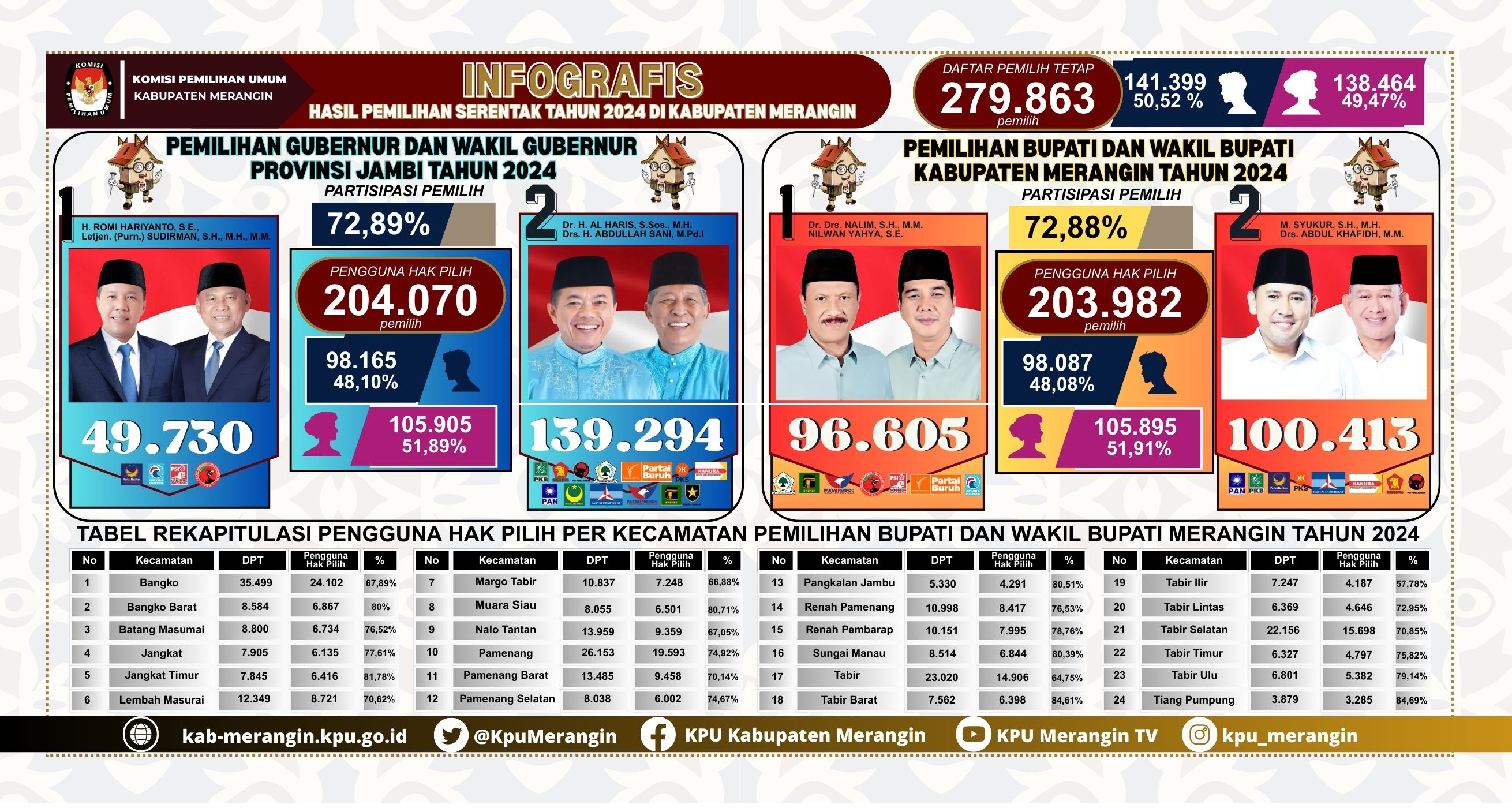 #TemanPemilih , berikut ini infografis Pemilihan Serentak Tahun 2024 terdiri dari perolehan suara pasangan calon Gubernur dan Wakil Gubernur Jambi di Kabupaten Merangin dan pasangan calon Bupati dan Wakil Bupati Merangin, serta Tabel Pengguna Hak Pilih di seluruh Kecamatan se-Kabupaten Merangin.
