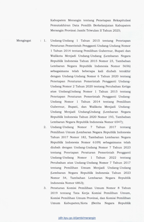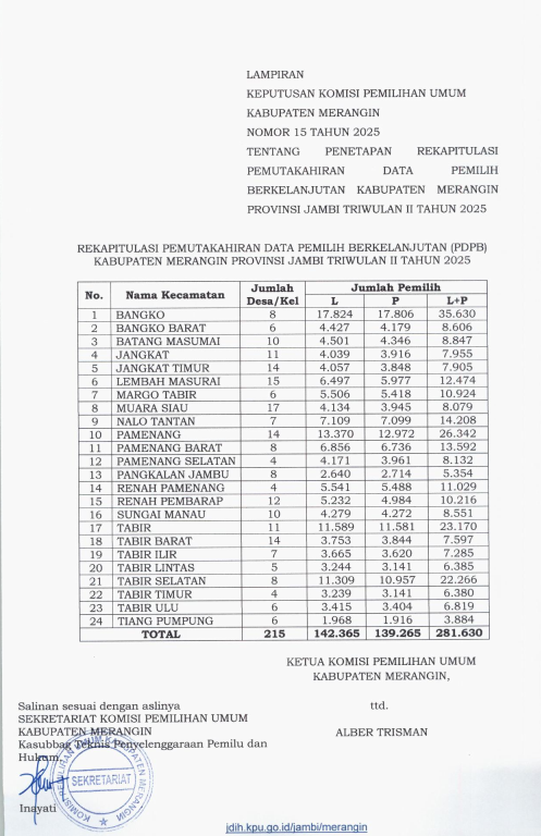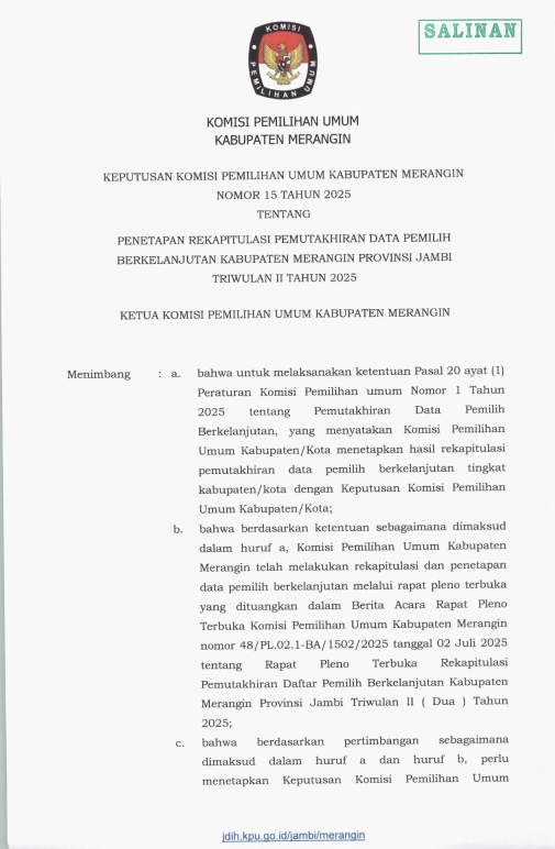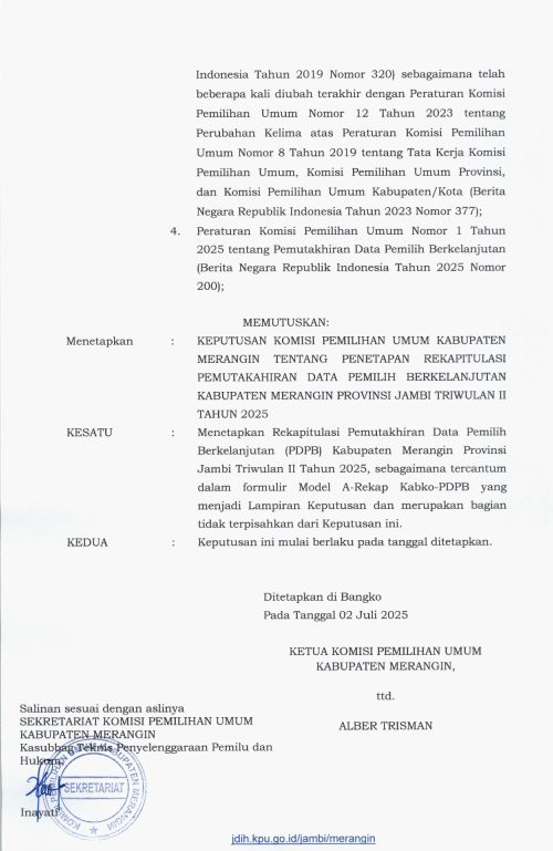 Keputusan KPU Kabupaten Merangin tentang Penetapan Rekapitulasi Pemutakhiran Data Pemilih Berkelanjutan Kabupaten Merangin Triwulan II Tahun 2025