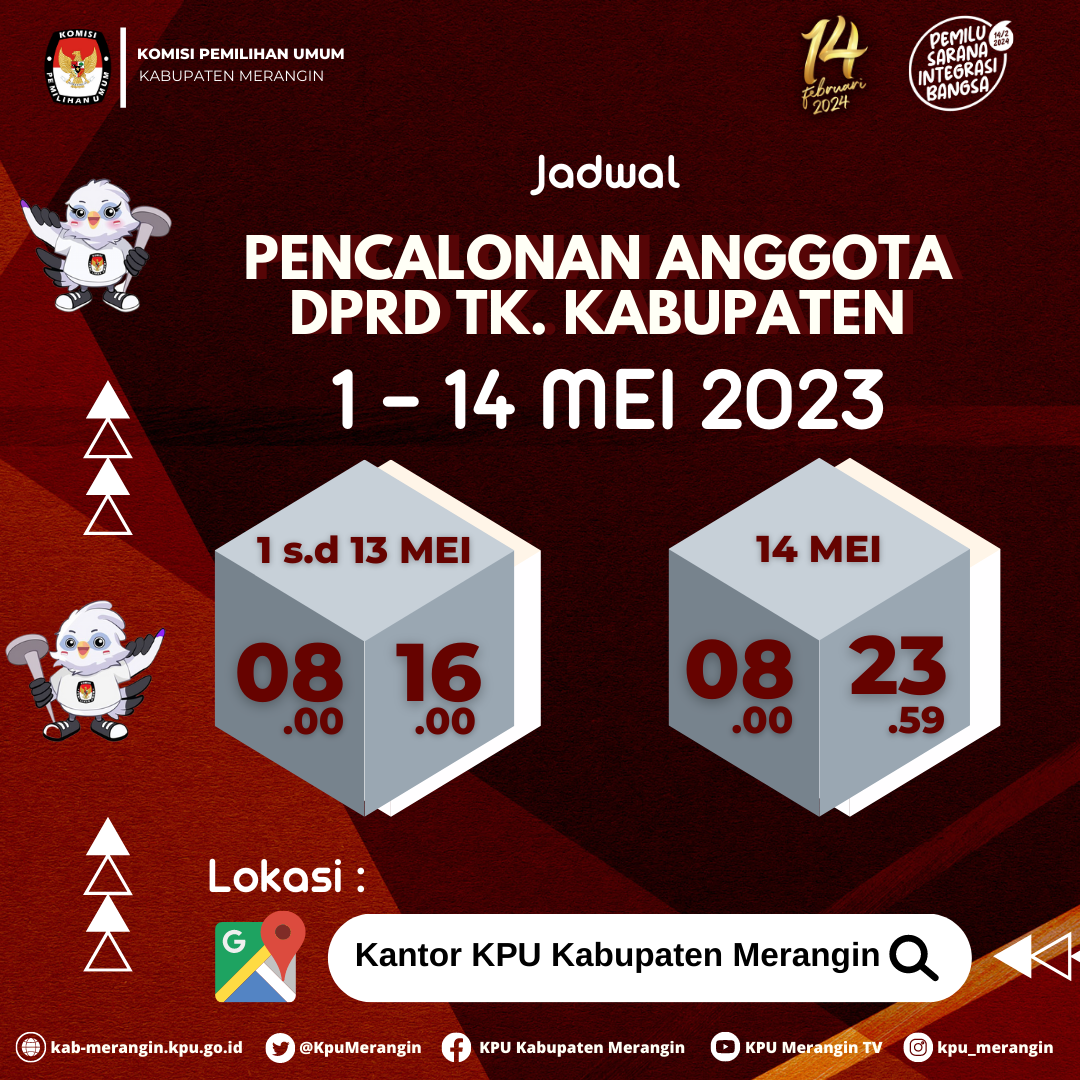(Bangko,24/4) KPU Kabupaten Merangin telah menyelesaikan satu demi satu Tahapan Pemilu Serentak Tahun 2024. Memasuki bulan Mei 2023 atau 9 (sembilan) bulan sebelum tanggal pemungutan suara, tahapan selanjutnya adalah pengajuan Bakal Calon anggota Dewan Perwakilan Rakyat Daerah (DPRD) Tingkat Kabupaten. Masa pelaksanaan tahapan tersebut dilaksanakan sesuai ketentuan Pasal 5 Peraturan KPU Nomor 10 Tahun 2023 tentang Pencalonan Anggota Dewan Perwakilan Rakyat, Dewan Perwakilan Rakyat Daerah Provinsi, dan Dewan Perwakilan Rakyat Kabupaten/Kota. KPU Kabupaten Merangin membuka pengajuan bakal calon anggota DPRD Tingkat Kabupaten dari tanggal 1 sampai dengan 14 Mei atau selama 14 hari.