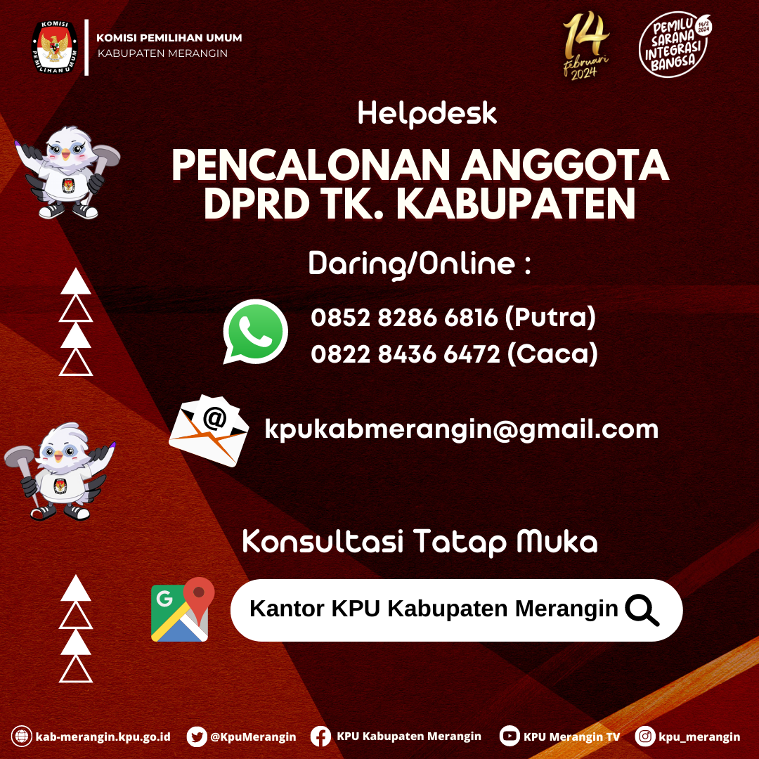 Oleh karena itu, KPU Kabupaten Merangin mengumumkan telah membuka masa pengajuan bakal calon anggota Dewan Perwakilan Rakyat Daerah Tingkat Kabupaten Merangin yang akan dilakukan oleh Partai Politik Peserta Pemilu melalui Pengumuman Nomor 341 Tahun 2023 yang dapat diunduh disini . KPU Kabupaten Merangin juga menyediakan layanan helpdesk yang membantu secara daring dan luring untuk bantuan kepada Pengurus Partai Politik Peserta Pemilu Tk. Kabupaten Merangin.