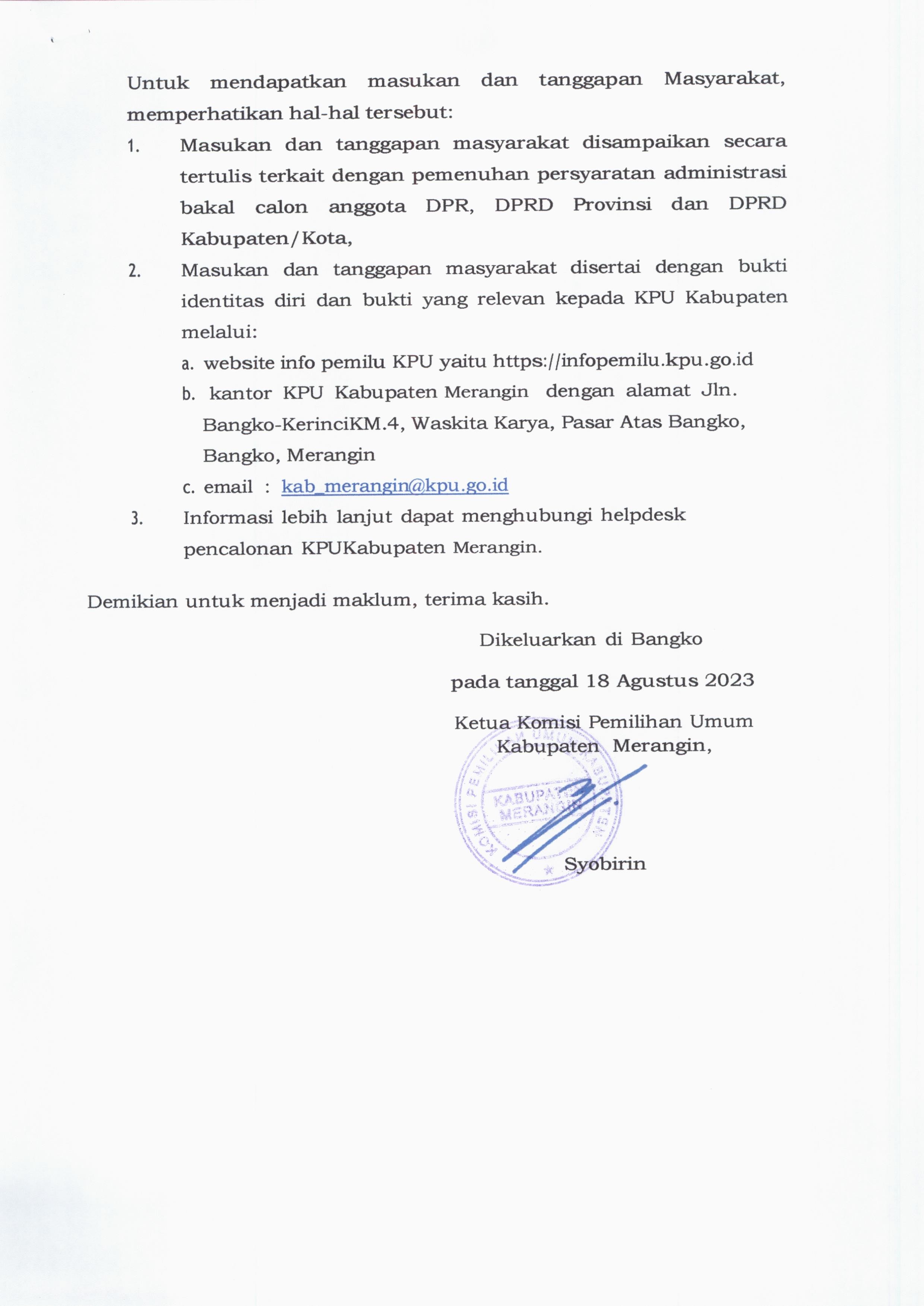 (Bangko,19/08) Hari ini Sabtu 19 Agustus 2023 KPU Kabupaten Merangin mengeluarkan Pengumuman Daftar Calon Sementara (DCS) DPRD Kabupaten Merangin #PemiluSerentak2024. Klik disini untuk mendapatkan dokumennya sehingga kamu dapat mengenali calon perwakilan sesuai daerah pemilihan teman pemilih masing-masing.