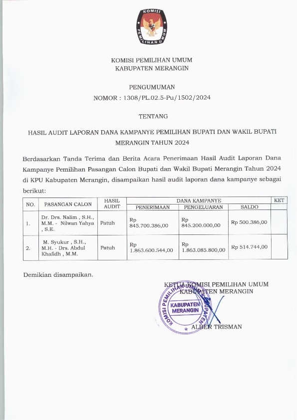(Bangko, 12/12) Halo #TemanPemilih, KPU Kabupaten Merangin merilis Pengumuman Nomor 1308/PL.02.5-Pu/1502/2024 tentang Hasil Audit Laporan Dana Kampanye Pemilihan Bupati dan Wakil Bupati Merangin Tahun 2024.