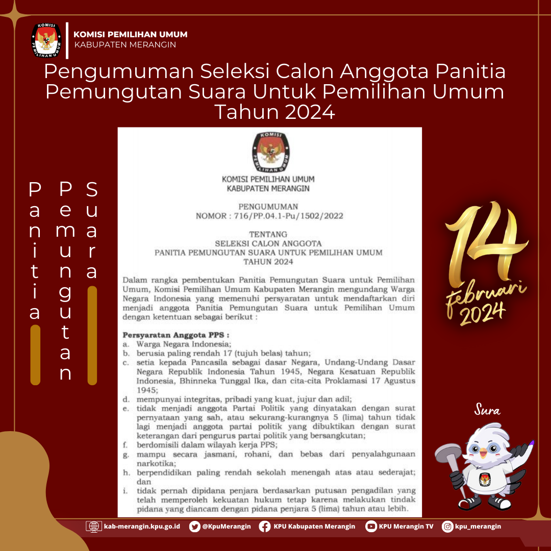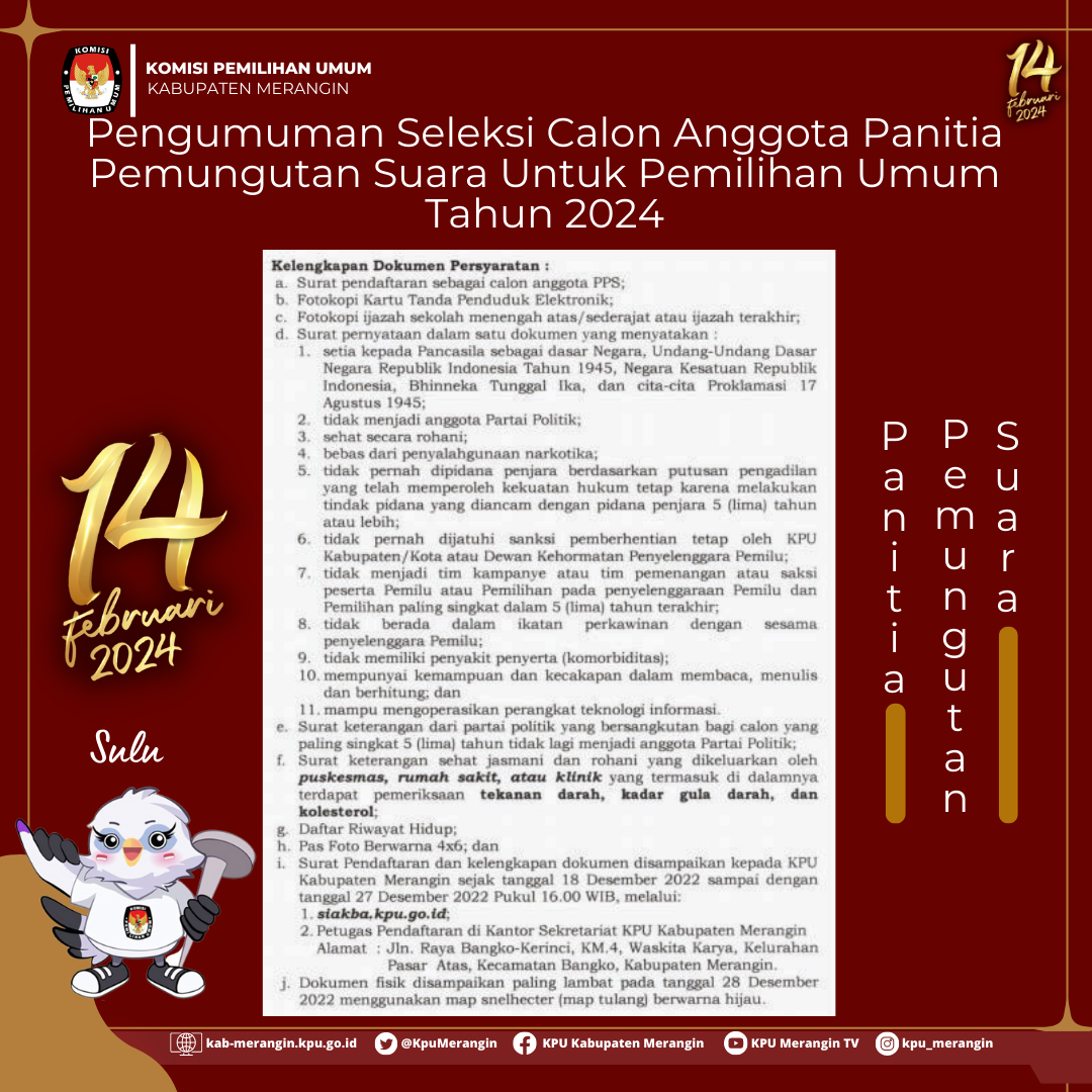 Panitia Pemungutan Suara adalah badan ad hoc yang dibentuk oleh KPU Kabupaten/Kota untuk menyelenggarakan Pemilu dan Pemilihan di tingkat kelurahan/desa. KPU Kabupaten Merangin membuka pendaftaran PPS secara elektronik melalui web SIAKBA: siakba.kpu.go.id