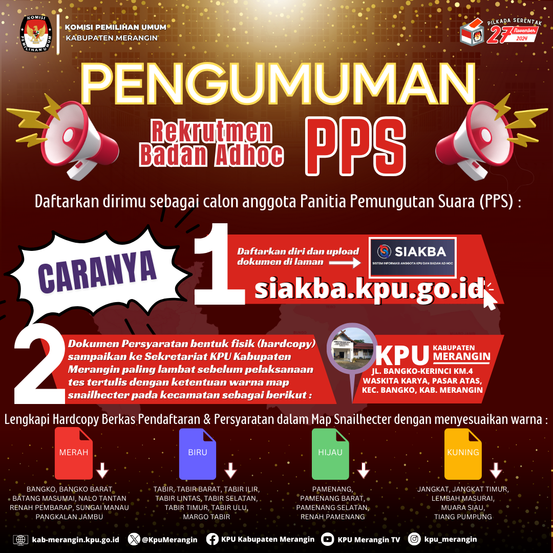 KPU Kabupaten Merangin membuka kesempatan kepada #TemanPemilih dalam Penerimaan Calon Anggota Panitia Pemungutan Suara (PPS) Pemilihan Serentak 2024 di Kabupaten Merangin, melalui Pengumuman Nomor 422/PP.04.2-Pu/1502/2024 tentang Seleksi Calon Anggota Panitia Pemungutan Suara Untuk Pemilihan Gubernur dan Wakil Gubernur Provinsi Jambi, Bupati dan Wakil Bupati Merangin Pada Kabupaten Merangin Tahun 2024.