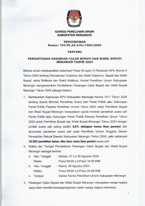 KPU Kabupaten Merangin mengumumkan Pendaftaran Pasangan Calon Bupati dan Wakil Bupati Merangin pada Pemilihan Serentak 2024 melalui Pengumuman Nomor 734/PL.02.2-Pu/1502/2024 tentang Pendaftaran Pasangan Calon Bupati dan Wakil Bupati Merangin Tahun 2024.
