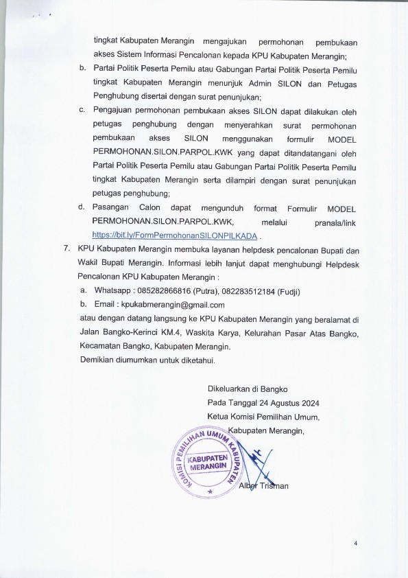 KPU Kabupaten Merangin membuka layanan helpdesk pencalonan Bupati dan Wakil Bupati Merangin. Informasi lebih lanjut dapat menghubungi Helpdesk Pencalonan KPU Kabupaten Merangin :