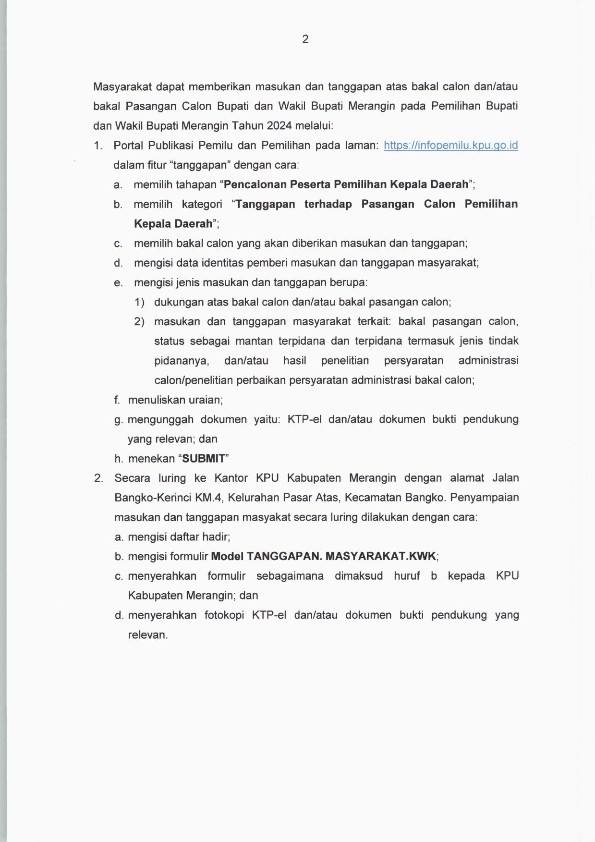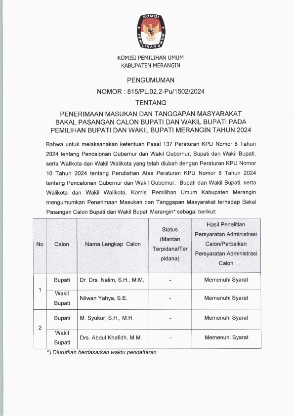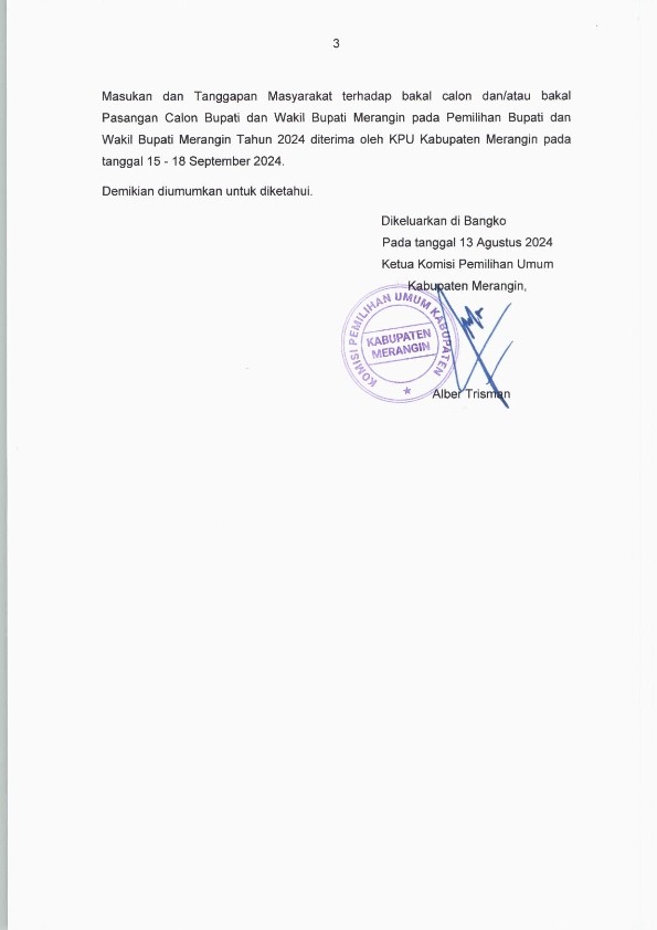 (Bangko, 13/9) Halo #TemanPemilih, KPU Kabupaten Merangin merilis Pengumuman Nomor 815/PL.02.2-Pu/1502/2024 tentang Penerimaan Masukan dan Tanggapan Masyarakat Bakal Pasangan Calon Bupati dan Wakil Bupati pada Pemilihan Bupati dan Wakil Bupati Merangin Tahun 2024.
