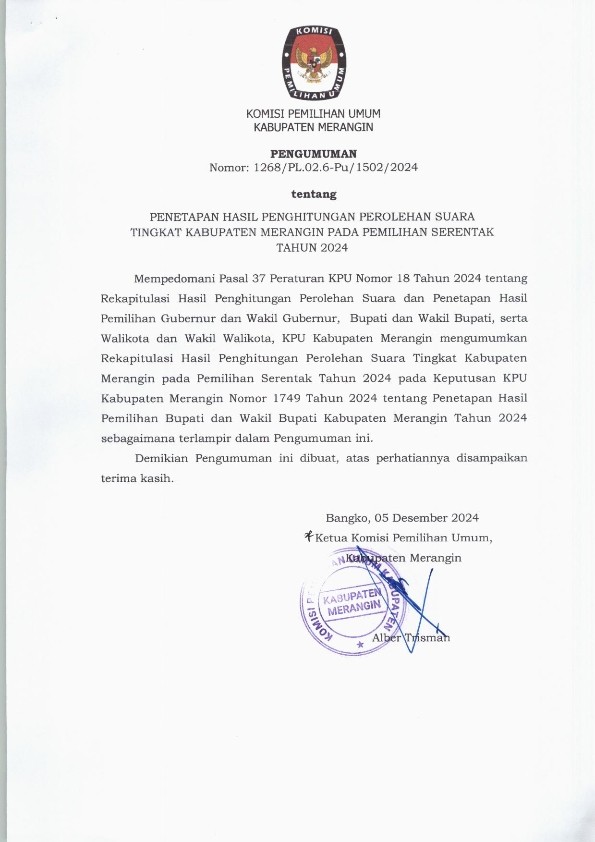 (Bangko, 5/12) Halo #TemanPemilih, KPU Merangin mengumumkan Penetapan Hasil Penghitungan Perolehan Suara Pemilihan Bupati dan Wakil Bupati Merangin pada Pemilihan Serentak Tahun 2024 pada Pengumuman Nomor 1268/PL.02.6-Pu/1502/2024.