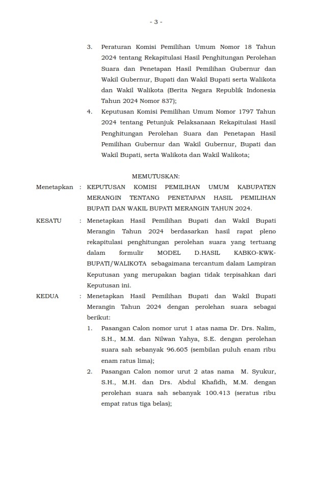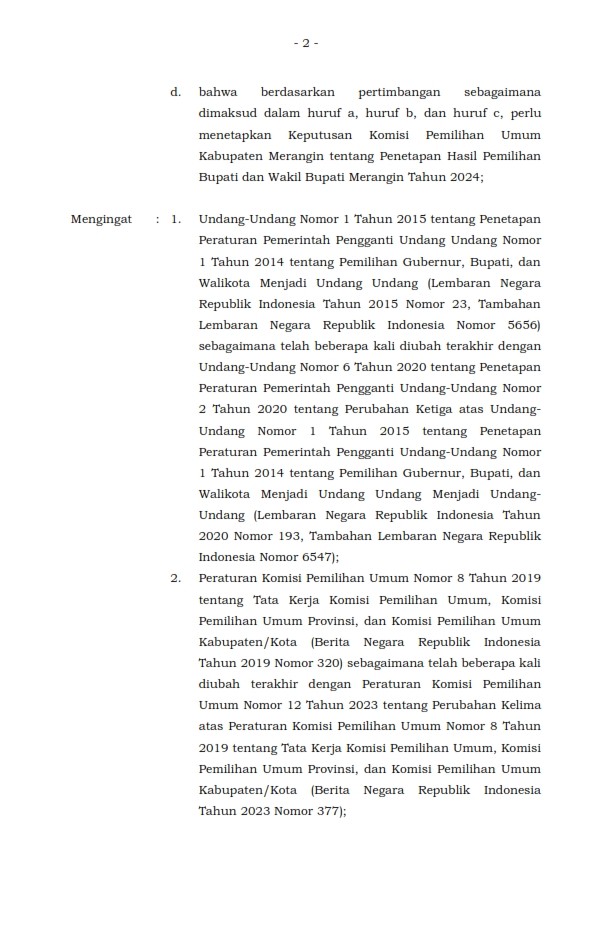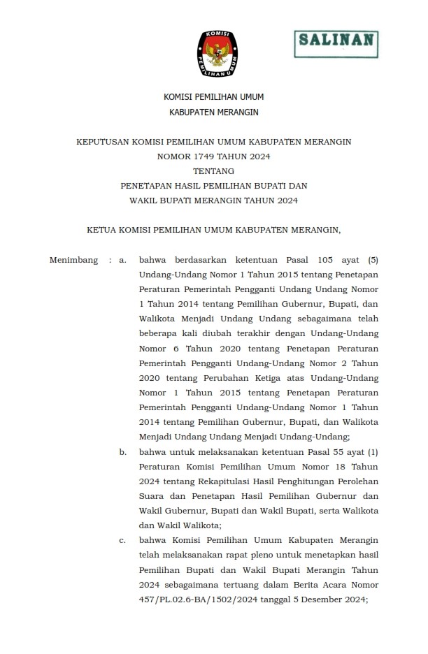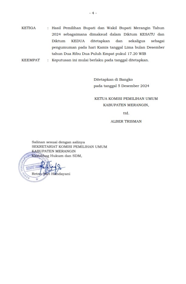 Berikut Pengumuman KPU Kabupaten Merangin Nomor 1268/PL.02.6-Pu/1502/2024 tanggal 5 Desember 2024