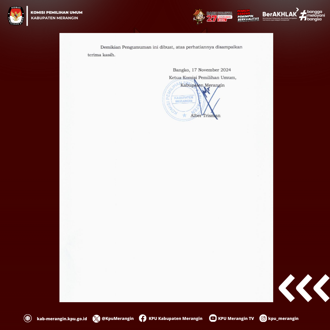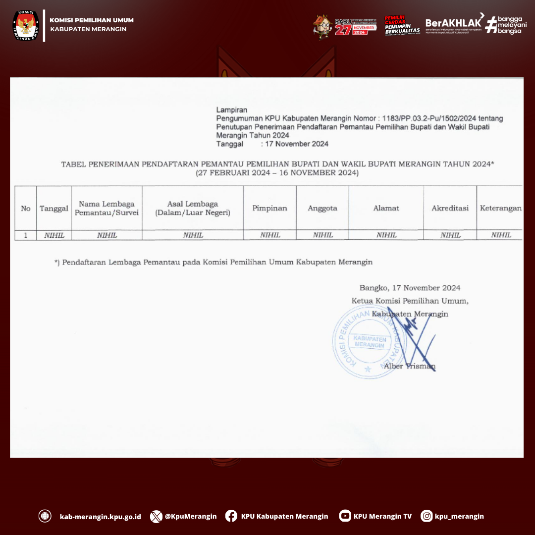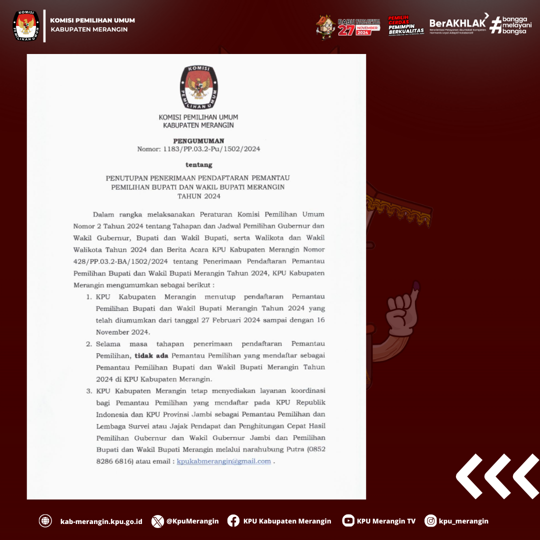 KPU Kabupaten Merangin merilis Pengumuman Nomor 1183/PP.03.2-Pu/1502/2024 tentang Penutupan Penerimaan Pendaftaran Pemantau Pemilihan Bupati dan Wakil Bupati Merangin Tahun 2024.