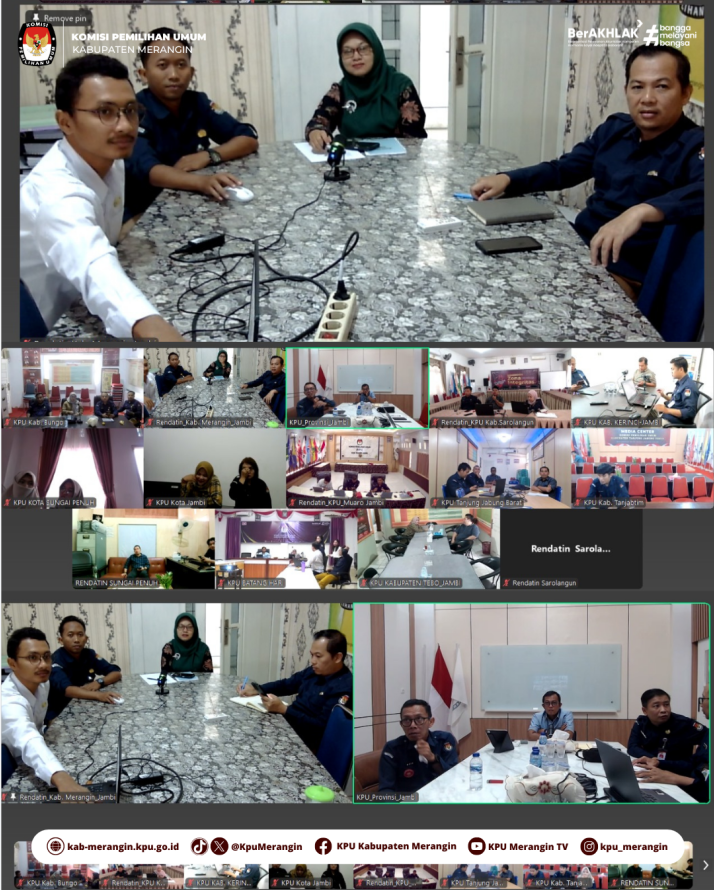 Bangko, KPU Kabupaten Merangin mengikuti Zoom Meeting bersama Ketua Divisi Perencanaan, Data dan Informasi, Kasubbag Perencanaan, Data dan Informasi, serta Admin/Operator Sidalih dari KPU Kabupaten/Kota se-Provinsi Jambi terkait Persiapan Launching Coklit Terbatas (Coktas) Serentak TW III 2025 secara virtual, dilaksanakan di ruang Media Center KPU Kabupaten Metangin, Selasa 29 Juli 2025.