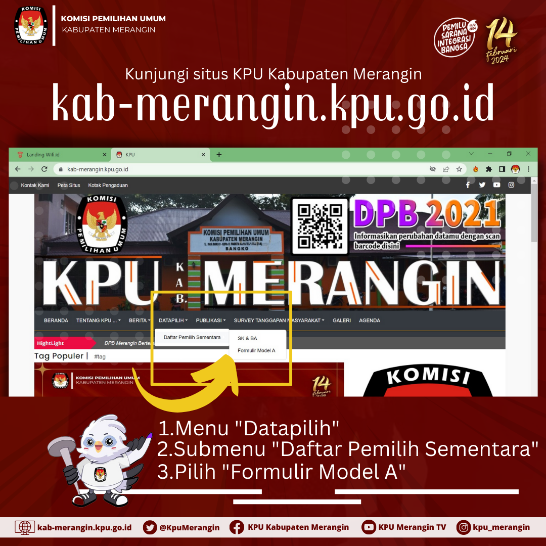 Selain itu KPU Kabupaten Merangin telah menyediakan menu DATAPILIH di website KPU Kabupaten Merangin : https://www.kab-merangin.kpu.go.id yang dapat diakses untuk melihat Formulir Model A. Caranya sebagai berikut :