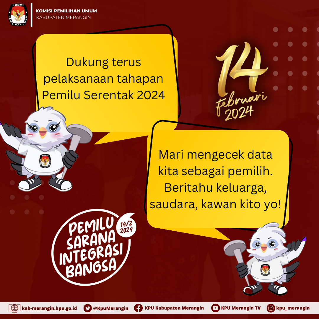 Tunggu apa lagi, segera periksa apakah kamu telah terdaftar sebagai Pemilih untuk dapat menggunakan hak pilih di Tempat Pemungutan Suara pada hari Rabu 14 Februari 2024. Dan mari mewujudkan Pemilu Sebagai Sarana Integrasi Bangsa. (PS)