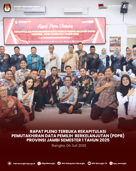 Halo #TemanPemilih, Anggota KPU Kabupaten Merangin divisi Perencanaan, Data dan Informasi Hayatul Mughiroh, beserta operator Sidalih KPU Kabupaten Merangin, menghadiri kegiatan Rapat Pleno Pemutakhiran Data Pemilih Berkelanjutan (PDPB) Provinsi Jambi Semester 1 Tahun 2025, bertempat di Aula Kantor KPU Provinsi Jambi (4 Juli 2025).