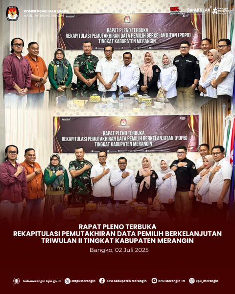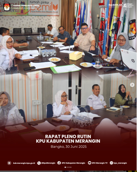 Halo #TemanPemilih, Rabu (2/7) KPU Kabupaten Merangin melaksanakan Rapat Pleno Terbuka Rekapitulasi Pemutakhiran Data Pemilih Berkelanjutan Triwulan II tingkaat Kabupaten Merangin Tahun 2025, dilaksanakan di Aula kantor KPU Kabuapten Merangin.