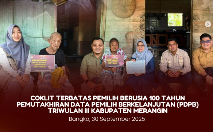 Bangko, Rabu (30/9), KPU Kabupaten Merangi melaksanakan kegiatan Pencocokan Terbatas (Coktas) dalam rangka Pemutakhiran Data Pemilih Berkelanjutan (PDPB) Triwulan III Tahun 2025 kepada pemilih berusia 100 tahun.