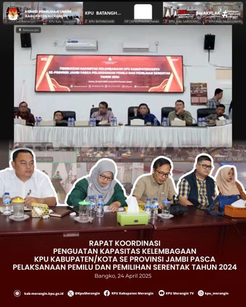 Halo #TemanPemilih, Anggota KPU Kabupaten Merangin Hengki didampingi kasubbag Teknis Penyelenggaraan Pemilu dan Hukum Inayati serta Operator ber Audiensi serta menyampaikan buku Dinamika Penanganan Pelanggaran dan Sengketa Hukum “Catatan Penyelenggaraan Pemilihan Kepala Daerah Serentak Tahun 2024 di Bumi Sepucuk Jambi Sembilan Lurah” kepada KPU Republik Indonesia. Acara ini berlangsung di Ruang Rapat Lantai 3, Gedung KPU RI, pada Jum`at (21/3/2025).