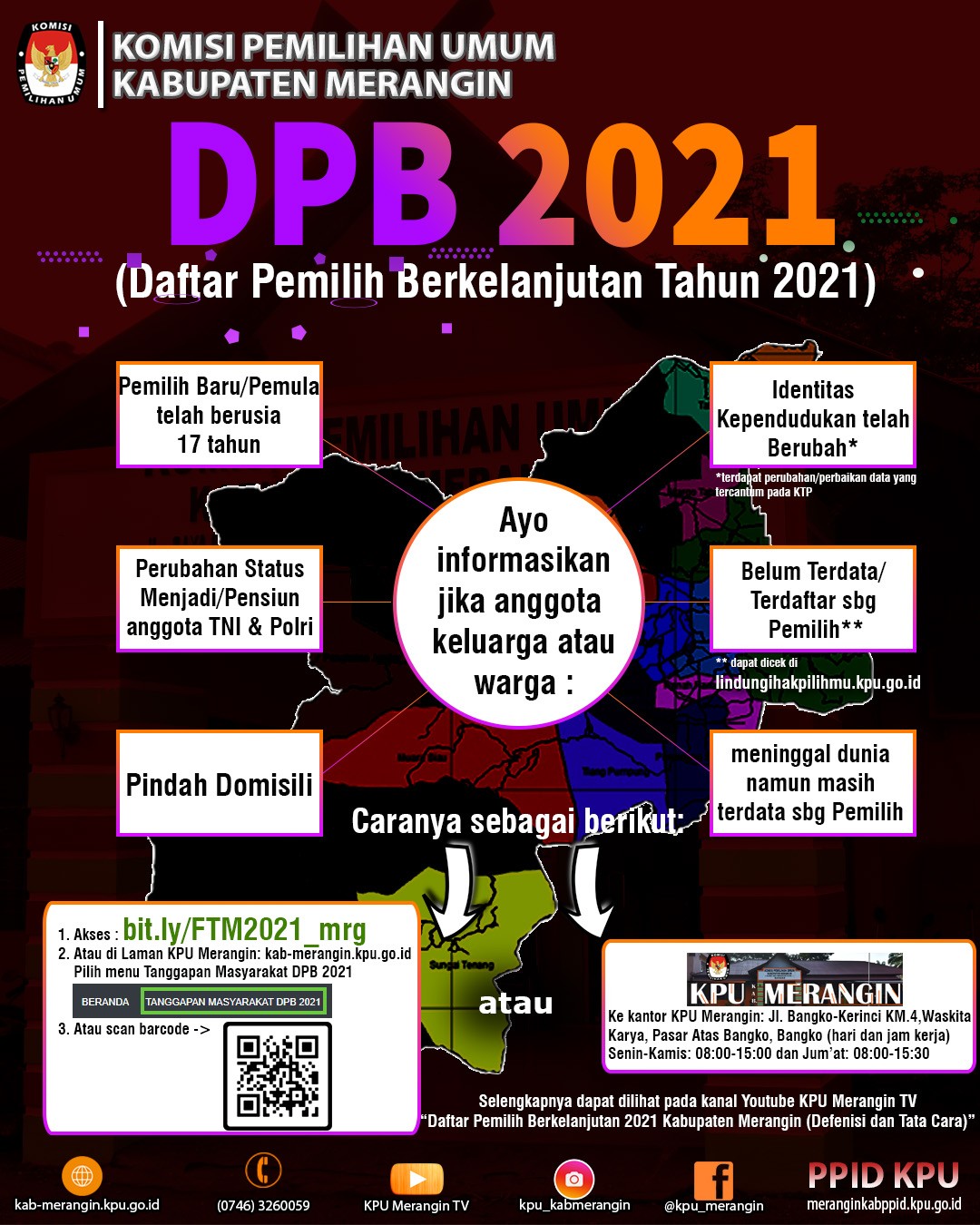 Salah satu elemen penting pelaksanaan tahapan Pemilu dan Pemilihan Kepala Daerah (Pilkada) adalah daftar pemilih. Daftar Pemilih yang akurat dan akuntabel akan bermuara pada peningkatan kualitas Pemilu dan Pilkada. Dalam setiap pelaksanaan Pemilu dan Pilkada, daftar pemilih selalu menemui persoalan yang sama yaitu pemilih yang tidak memenuhi syarat masih terdaftar sebagai pemilih. Atau sebaliknya sudah memenuhi syarat tetapi tidak terdaftar sebagai pemilih. Varian permasalahan tersebut disebabkan karena meninggal dunia, pindah domisili, menjadi TNI/Polri, belum memenuhi syarat usia. Guna menjawab tantangan tersebut Komisi Pemilihan Umum Kabupaten Merangin, melaksanakan Pemutakhiran Data Pemilih Berkelanjutan (PDPB). PDPB ini bertujuan untuk memperbaharui data pemilih guna mempermudah proses pemutakhiran data dan penyusunan daftar pemilih pada saat Pemilu atau Pilkada selanjutnya. Secara teknis PDPB dilakukan dengan cara: menambah pemilih baru, mencoret pemilih yang tidak memenuhi syarat (TMS), dan memperbaiki elemen data pemilih. PDPB ini akan dilaksanakan secara stimulan setiap bulan. Pada proses PDPB KPU Kabupaten Merangin membuka partisipasi masyarakat untuk terlibat aktif dengan cara memberikan masukan, saran, dan informasi terkait daftar pemilih. Masyarakat dapat menyampaikannya secara offline seperti dengan datang ke Kantor KPU Kabupaten Merangin, Jl. Bangko-Kerinci KM.4 Waskita Karya, dan juga dengan online. dengan mengunjungi website KPU Merangin kab-merangin.kpu.go.id . Berikan masukan/tanggapan anda langsung melalui link berikut. Namun jika terkendala dalam pengisian formulir online pemutakhiran data pemilih berkelanjutan, silakan menyaksikan video dengan klik disini. (ah)