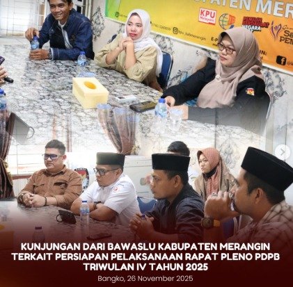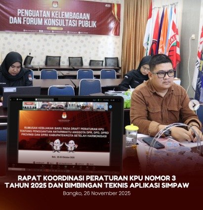 Bangko, KPU Kabupaten Merangin mengikuti Rapat Koordinasi PKPU No. 3 Tahun 2025 dan Bimtek Aplikasi SIMPAW yang diselenggarakan oleh KPU Provinsi Jambi secara daring, (Rabu, 26/11/2025).