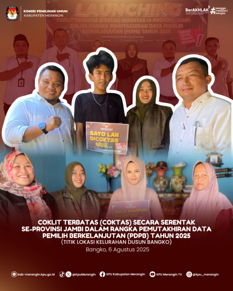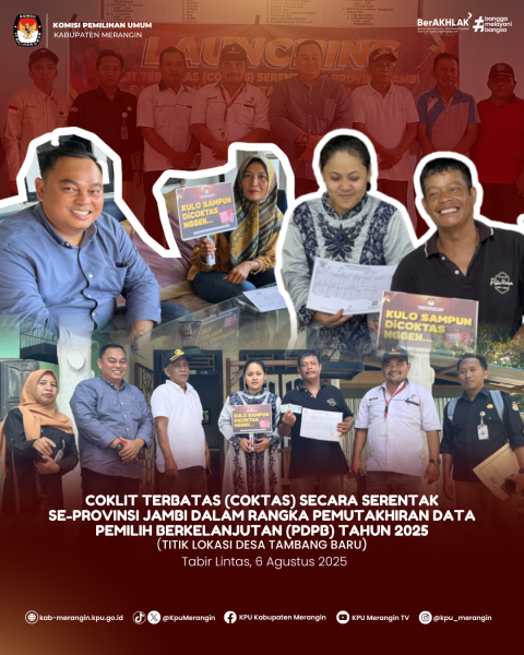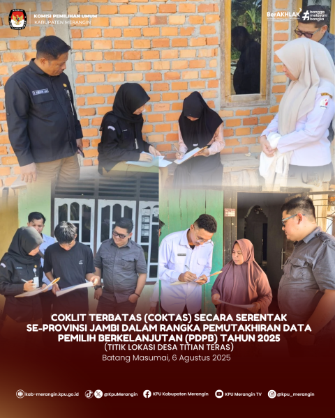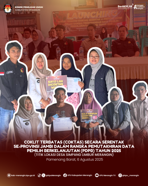 Rabu (6/8), KPU Kabupaten Merangin mengikuti kegiatan Launching Coklit Terbatas (Coktas) Serentak di Provinsi Jambi secara virtual, serta melaksanakan giat Pencocokan Terbatas (Coktas) dalam rangka Pemutakhiran Data Pemilih Berkelanjutan (PDPB) tahun 2025. Kegiatan launching Coktas ini dihadiri oleh Ketua Divisi Data dan Informasi KPU RI, Betty Epsilon Idroos, Plh. Ketua KPU Provinsi Jambi, anggota divisi , jajaran sekretariat KPU Kab/Kota se-Provinsi Jambi, serta tamu undangan. Pencocokan Terbatas (Coktas) dilaksanakan juga oleh Anggota KPU Kabupaten Merangin Kenny Ave Sayuti beserta staf pelaksana, kegiatan ini dilaksanakan di 5 (lima) titik lokasi yang telah dipetakan, salah satu nya di Desa Titian Teras kecamatan Batang Masumai. Melalui kegiatan Coktas ini, dilakukan proses verifikasi langsung terhadap data pemilih yang mengalami perubahan elemen data, termasuk pemilih baru, pemilih tidak memenuhi syarat (TMS), serta pemilih pindahan. Verifikasi ini penting untuk menjamin agar daftar pemilih yang disusun benar-benar mencerminkan kondisi faktual di lapangan. ⠀ KPU Kabupaten Merangin berkomitmen untuk terus melaksanakan pemutakhiran data pemilih secara akurat dan transparan demi terselenggaranya pemilu dan pemilihan yang demokratis, inklusif, dan berintegritas.