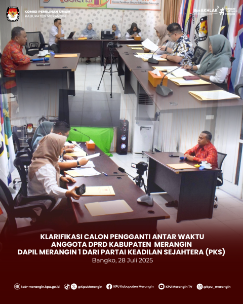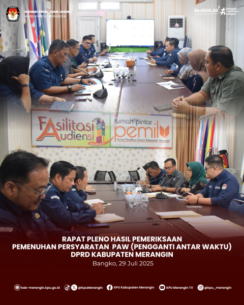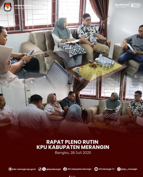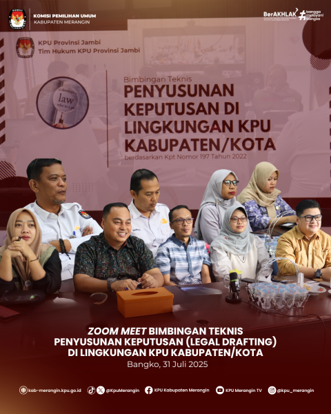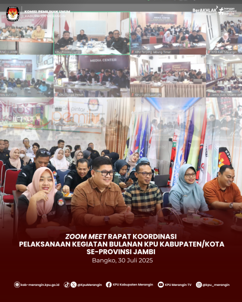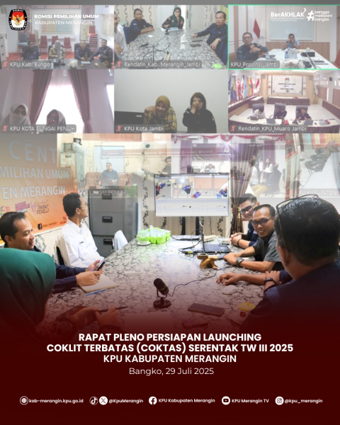Bangko, KPU Kabupaten Merangin mengikuti Zoom Meeting bersama Ketua Divisi Perencanaan, Data dan Informasi, Kasubbag Perencanaan, Data dan Informasi, serta Admin/Operator Sidalih dari KPU Kabupaten/Kota se-Provinsi Jambi terkait Persiapan Launching Coklit Terbatas (Coktas) Serentak TW III 2025 secara virtual, dilaksanakan di ruang Media Center KPU Kabupaten Metangin, Selasa 29 Juli 2025.