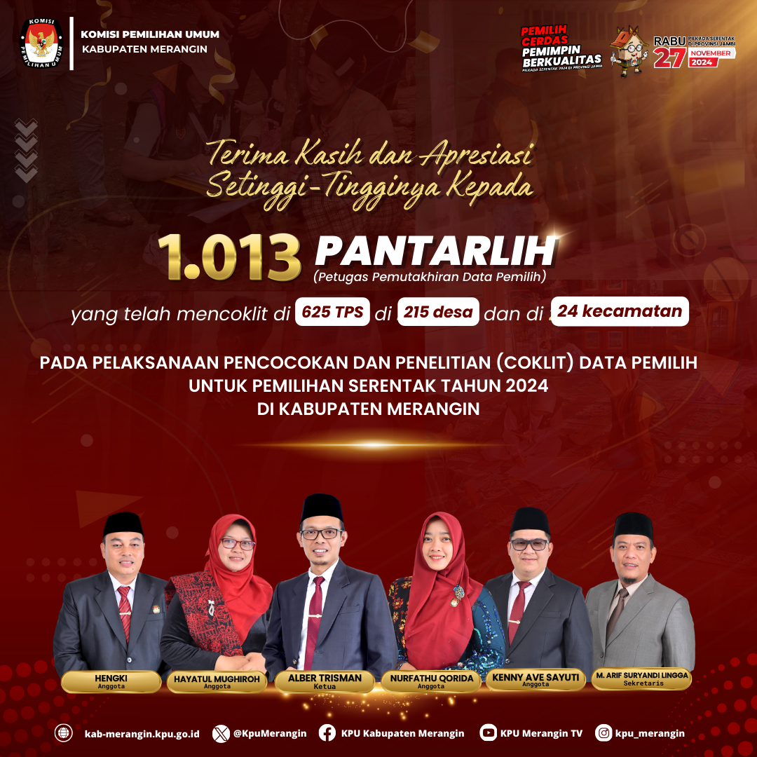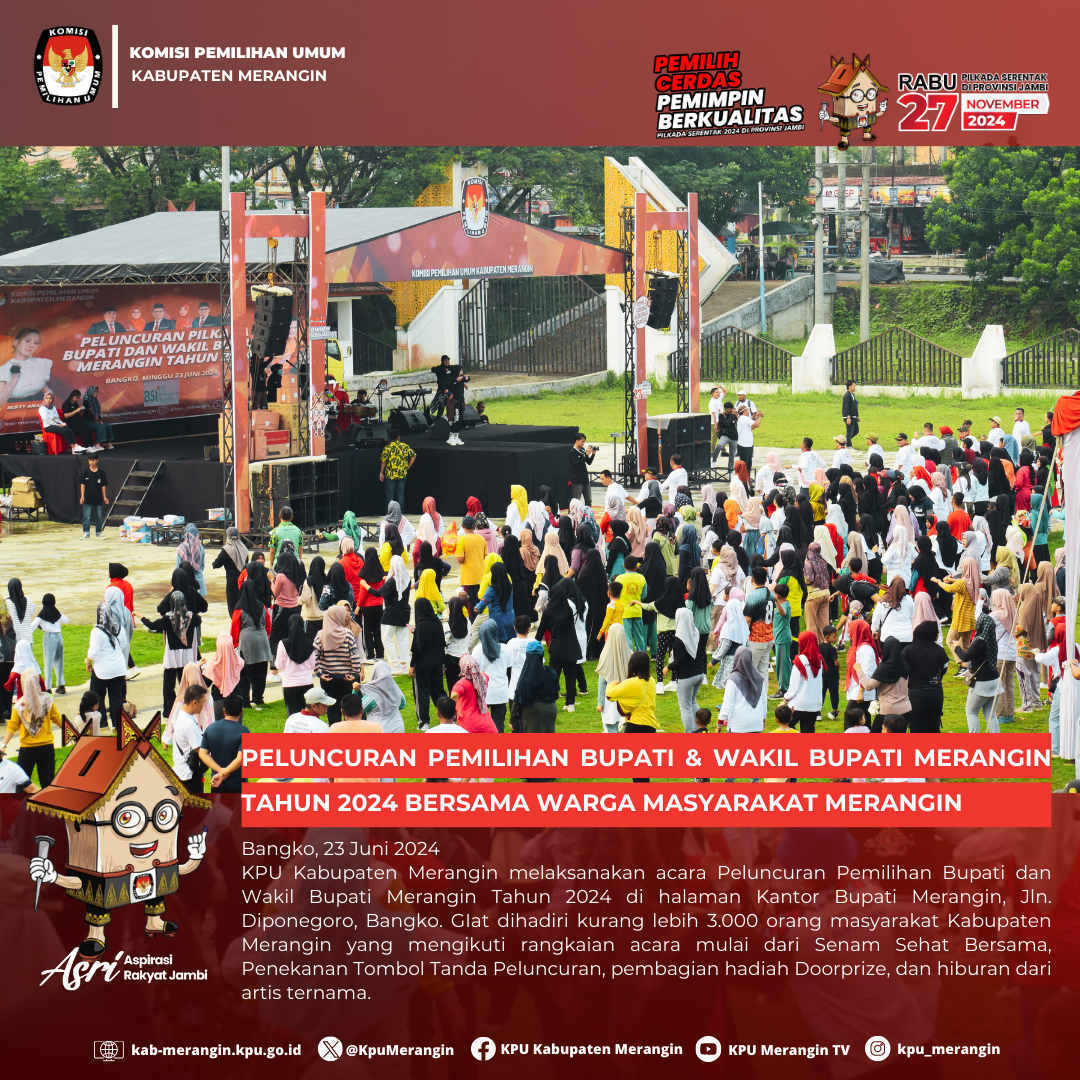 (Bangko, 23/6) Dalam rangka menyosialisaskan Pemilihan Serentak Tahun 2024 yang lebih masif, KPU Kabupaten Merangin mengadakan acara Peluncuran Pemilihan Bupati dan Wakil Bupati Merangin Tahun 2024 pada Minggu 23 Juni 2024 pagi. Acara yang dilaksanakan di halaman Kantor Bupati Merangin Jalan Diponegoro, Bangko terdiri dari senam sehat bersama, hiburan artis ternama, pemberian hadiah dalam Lomba Tari Kreasi Badan Adhoc Jingle Pilkada Jambi 2024, penarikan hadiah doorprize, dan terutama penekanan tombol sirine sebagai tanda diluncurkannya Pemilihan Bupati dan Wakil Bupati Merangin Tahun 2024.