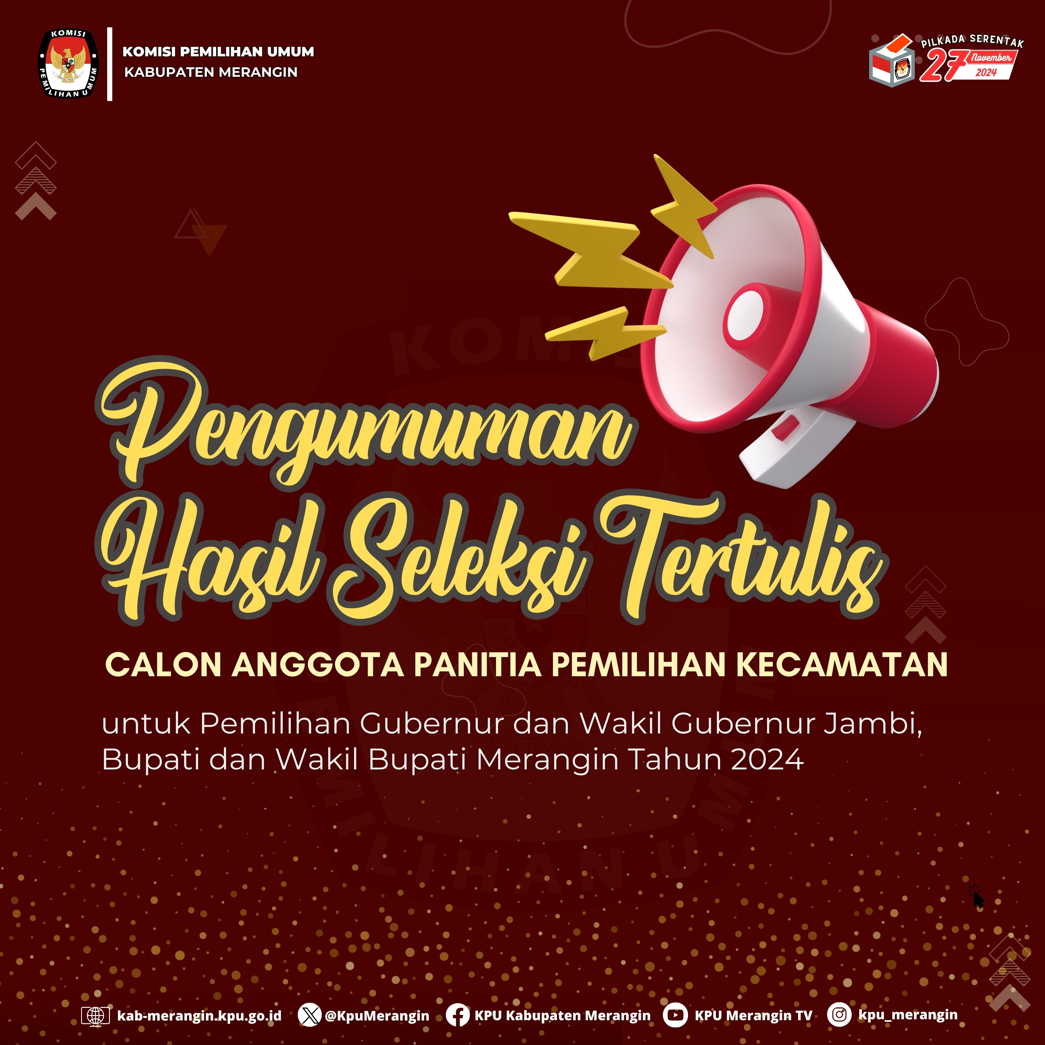 Sehubungan dengan hasil pelaksanaan Seleksi Tertulis Calon Anggota Panitia Pemilihan Kecamatan untuk Pemilihan Gubernur dan Wakil Gubernur Jambi, Bupati dan Wakil Bupati Merangin Tahun 2024 pada tanggal 6 dan 7 Mei 2024,Komisi Pemilihan Umum Kabupaten Merangin telah menetapkan Calon Anggota Panitia Pemilihan Kecamatan berjumlah 250 (Dua Ratus Lima Puluh) orang yang dinyatakan Lulus untuk dapat mengikuti Seleksi Wawancara.