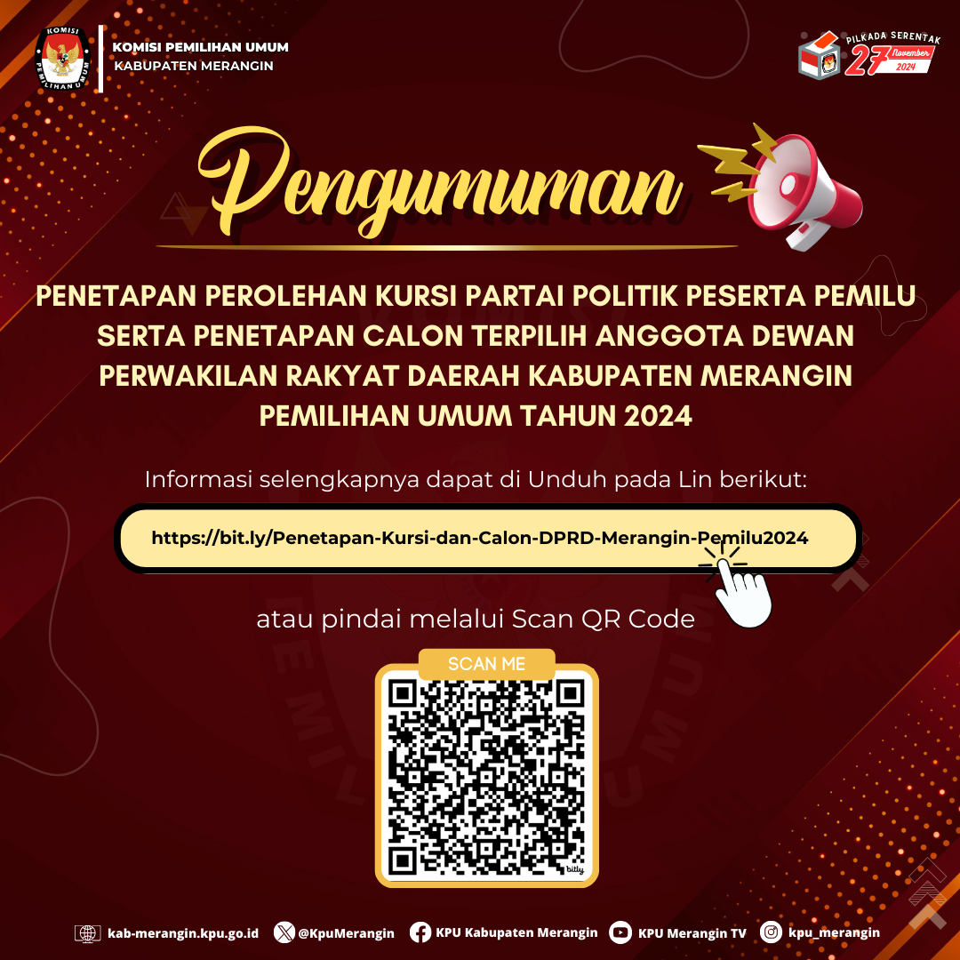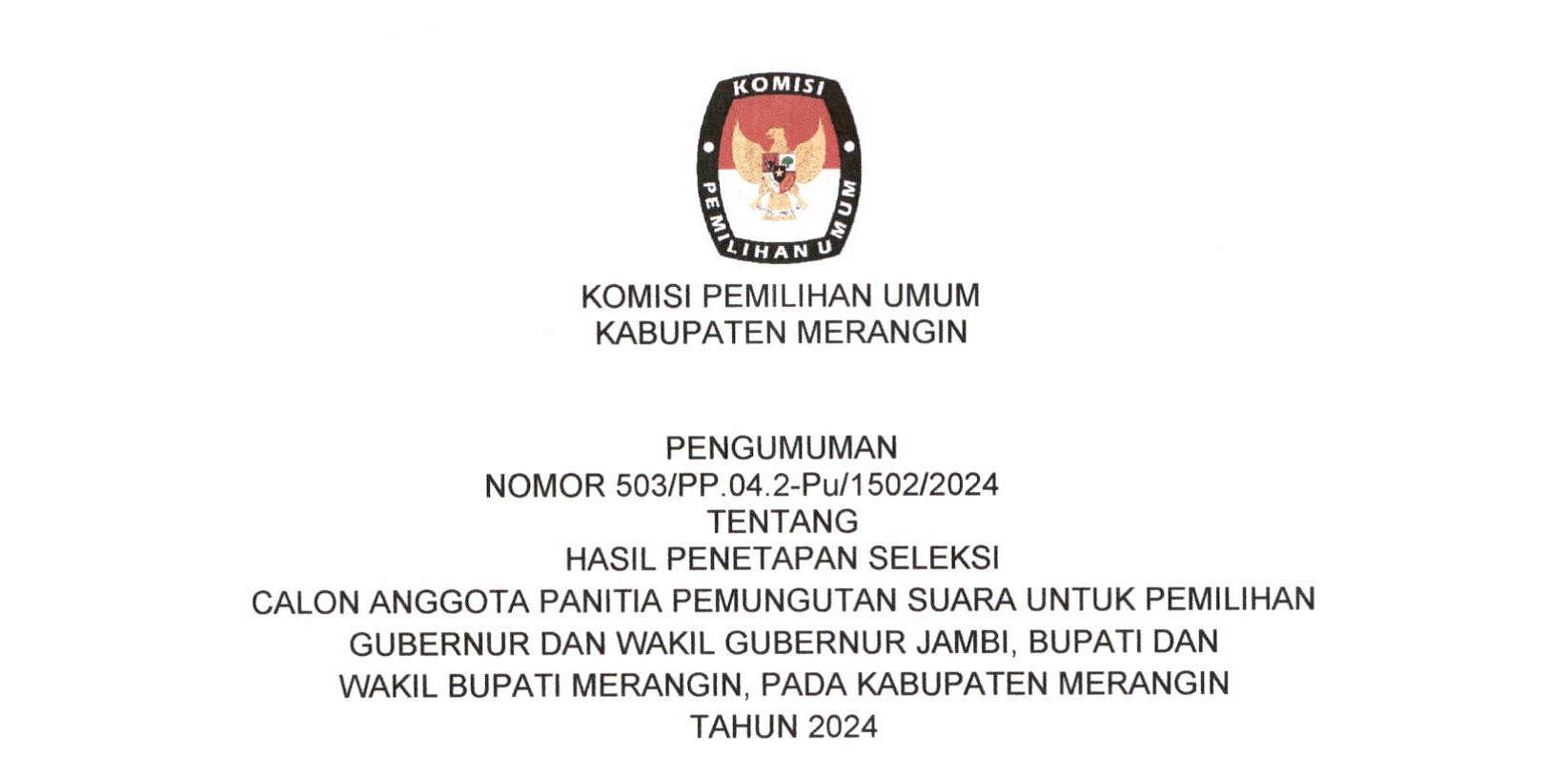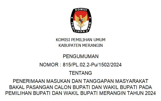 Halo #TemanPemilih! KPU Kabupaten Merangin merilis Pengumuman Nomor 826.PL.02.2-Pu/1502/2024 tentang Visi, Misi, dan Program Bakal Pasangan Calon Bupati dan Wakil Bupati Merangin pada Pemilihan Serentak Tahun 2024 yang dapat diunduh disini.