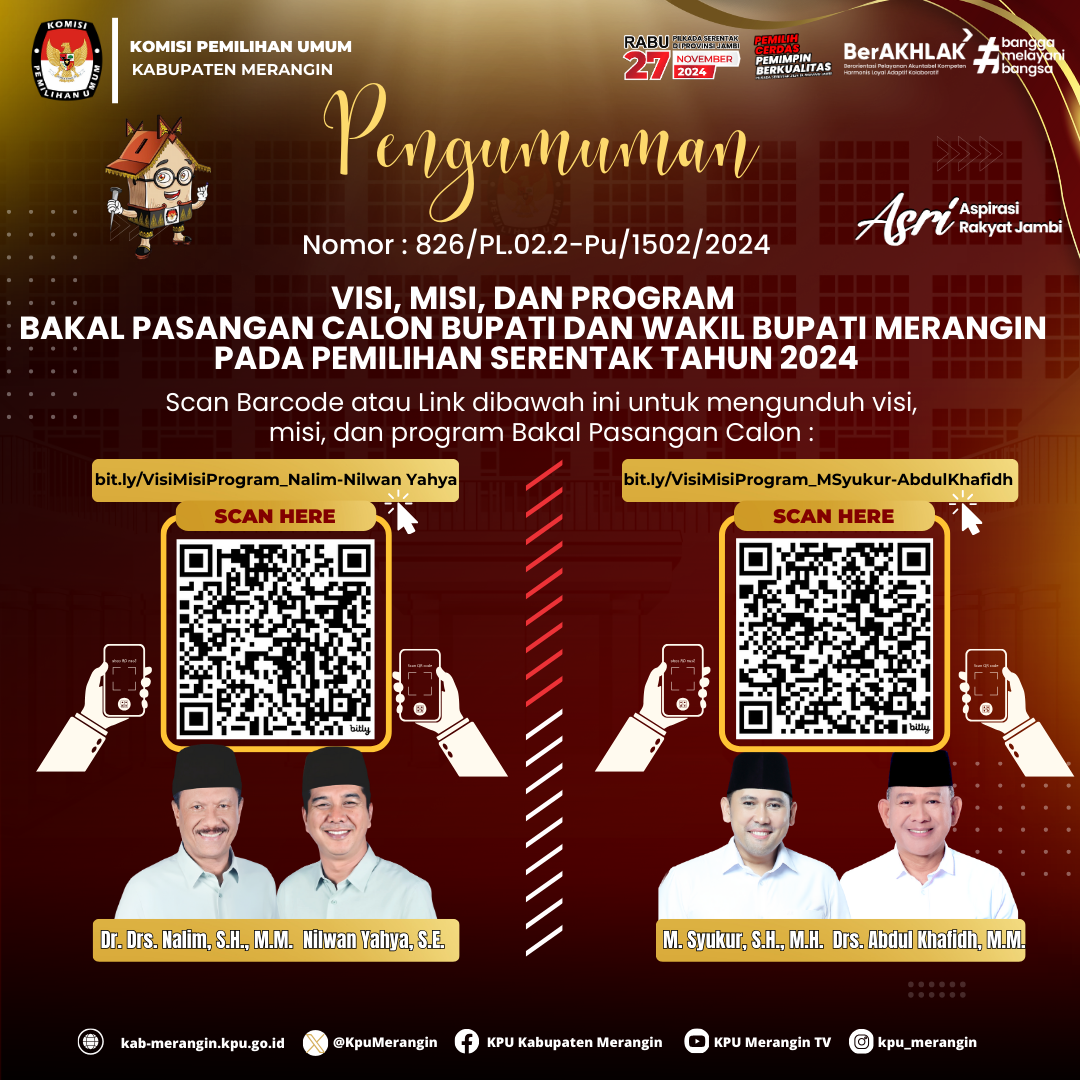 Payo kenali pilihanmu dengan mengetahui visi, misi, dan program masing-masing Bakal Pasangan Calon Bupati dan Wakil Bupati Merangin :