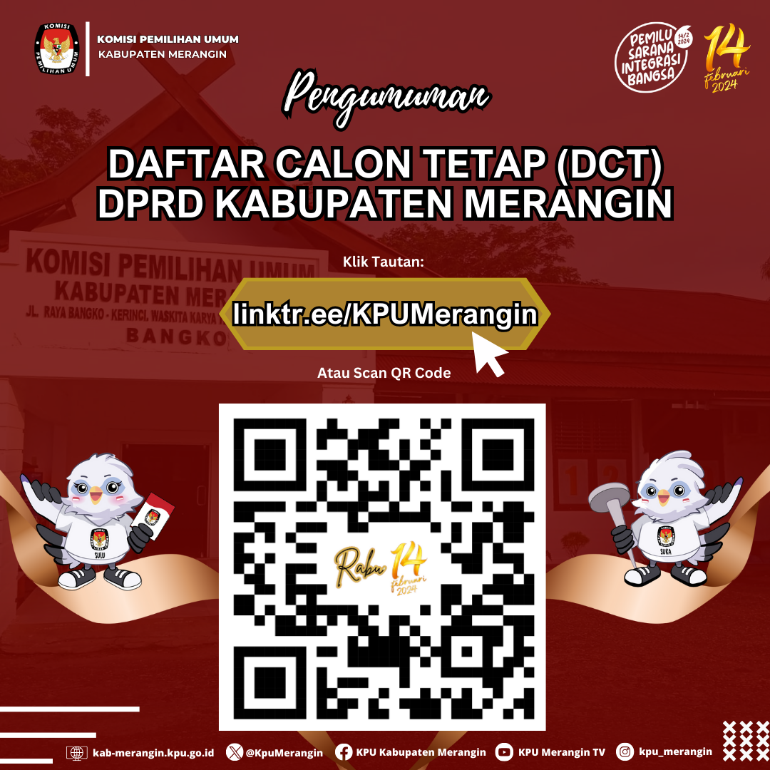 (Bangko, 04/11) Halo #TemanPemilih, hari ini Sabtu 4 November 2023 KPU Kabupaten Merangin telah menetapkan Daftar Calon Tetap (DCT) Calon Anggota DPRD Kabupaten Merangin. Sebagai informasi, pencalonan legislatif sudah memasuki tahapan akhir yaitu Penetapan Daftar Calon Tetap (DCT). KPU Kabupaten Merangin telah menetapkan 455 calon yang terdiri dari 299 calon laki-laki dan 156 calon perempuan yang diusung dari 16 Partai Politik Peserta Pemilu 2024 (dari total 18 parpol nasional) yang akan menjadi peserta Pemilu 2024 untuk Dewan Perwakilan Rakyat Daerah (DPRD) Kabupaten Merangin.
