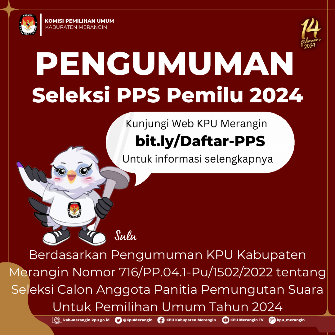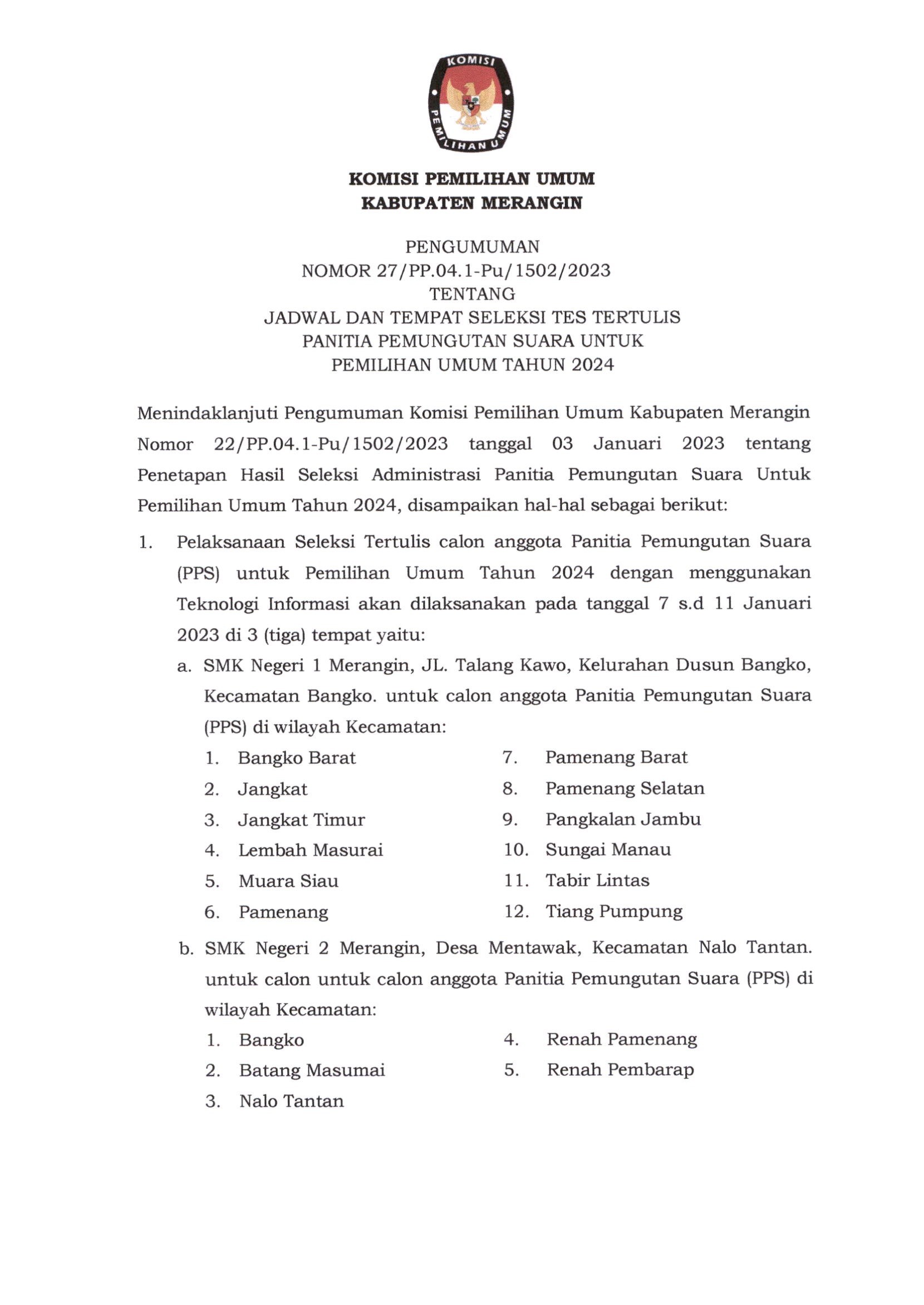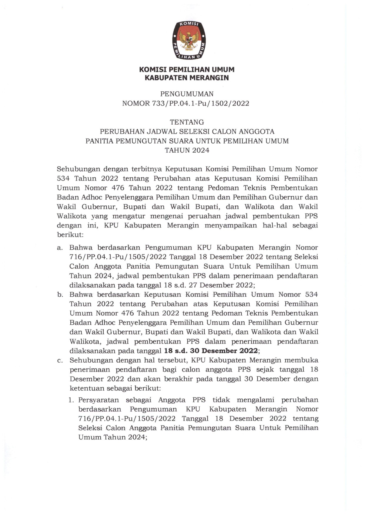 Sehubungan dengan terbitnya Keputusan Komisi Pemilihan Umum Nomor 534 Tahun 2022 tentang Perubahan atas Keputusan Komisi Pemilihan Umum Nomor 476 Tahun 2022 tentang Pedoman Teknis Pembentukan Badan Adhoc Penyelenggara Pemilihan Umum dan Pemilihan Gubernur dan Wakil Gubernur, Bupati dan Wakil Bupati, dan Walikota dan Wakil Walikota yang mengatur mengenai peruahan jadwal pembentukan PPS dengan ini, KPU Kabupaten Merangin menyampaikan hal-hal sebagai berikut: Bahwa berdasarkan Pengumuman KPU Kabupaten Merangin Nomor 716/PP.04.1-Pu/1505/2022 Tanggal 18 Desember 2022 tentang Seleksi Calon Anggota Panitia Pemungutan Suara Untuk Pemilihan Umum Tahun 2024, jadwal pembentukan PPS dalam penerimaan pendaftaran dilaksanakan pada tanggal 18 s.d. 27 Desember 2022; Bahwa berdasarkan Keputusan Komisi Pemilihan Umum Nomor 534 Tahun 2022 tentang Perubahan atas Keputusan Komisi Pemilihan Umum Nomor 476 Tahun 2022 tentang Pedoman Teknis Pembentukan Badan Adhoc Penyelenggara Pemilihan Umum dan Pemilihan Gubernur dan Wakil Gubernur, Bupati dan Wakil Bupati, dan Walikota dan Wakil Walikota, jadwal pembentukan PPS dalam penerimaan pendaftaran dilaksanakan pada tanggal 18 s.d. 30 Desember 2022; Sehubungan dengan hal tersebut, KPU Kabupaten Merangin membuka penerimaan pendaftaran bagi calon anggota PPS sejak tanggal 18 Desember 2022 dan akan berakhir pada tanggal 30 Desember dengan ketentuan sebagai berikut: Persyaratan sebagai Anggota PPS tidak mengalami perubahan berdasarkan Pengumuman KPU Kabupaten Merangin Nomor 716/PP.04.1-Pu/1505/2022 Tanggal 18 Desember 2022 tentang Seleksi Calon Anggota Panitia Pemungutan Suara Untuk Pemilihan Umum Tahun 2024; Dokumen Persyaratan yang telah diterima sebelum terbitnya Keputusan Komisi Pemilihan Umum Nomor 534 Tahun 2022 tentang Perubahan atas Keputusan Komisi Pemilihan Umum Nomor 476 Tahun 2022 tentang Pedoman Teknis Pembentukan Badan Adhoc Penyelenggara Pemilihan Umum dan Pemilihan Gubernur dan Wakil Gubernur, Bupati dan Wakil Bupati, dan Walikota dan Wakil Walikota dapat diterima. Dokumen Persyaratan yang diterima setelah terbitnya Keputusan Komisi Pemilihan Umum Nomor 534 Tahun 2022 tentang Perubahan atas Keputusan Komisi Pemilihan Umum Nomor 476 Tahun 2022 tentang Pedoman Teknis Pembentukan Badan Adhoc Penyelenggara Pemilihan Umum dan Pemilihan Gubernur dan Wakil Gubernur, Bupati dan Wakil Bupati, dan Walikota dan Wakil Walikota menyesuaikan dengan ketentuan jadwal perubahan. Surat Pendaftaran dan kelengkapan dokumen disampaikan kepada KPU Kabupaten Merangin sejak tanggal 18 Desember 2022 sampai dengan tanggal 30 Desember 2022 Pukul 16.00 waktu setempat, melalui: siakba.kpu.go.id dan dokumen persyaratan dalam bentuk hardcopy diserahkan ke KPU Kabupaten Merangin paling lambat 1 (satu) hari sebelum penelitian administrasi berakhir, pada tanggal 1 Januari 2023 dengan menggunakan map snelhecter (map tulang) berwarna hijau; atau Petugas Pendaftaran di Kantor Sekretariat KPU Kabupaten Merangin Alamat : Jln. Raya Bangko-Kerinci, KM.4, Waskita Karya, Kel. Pasar Atas, Kecamatan Bangko, Kabupaten Merangin. Download File Pengumuman