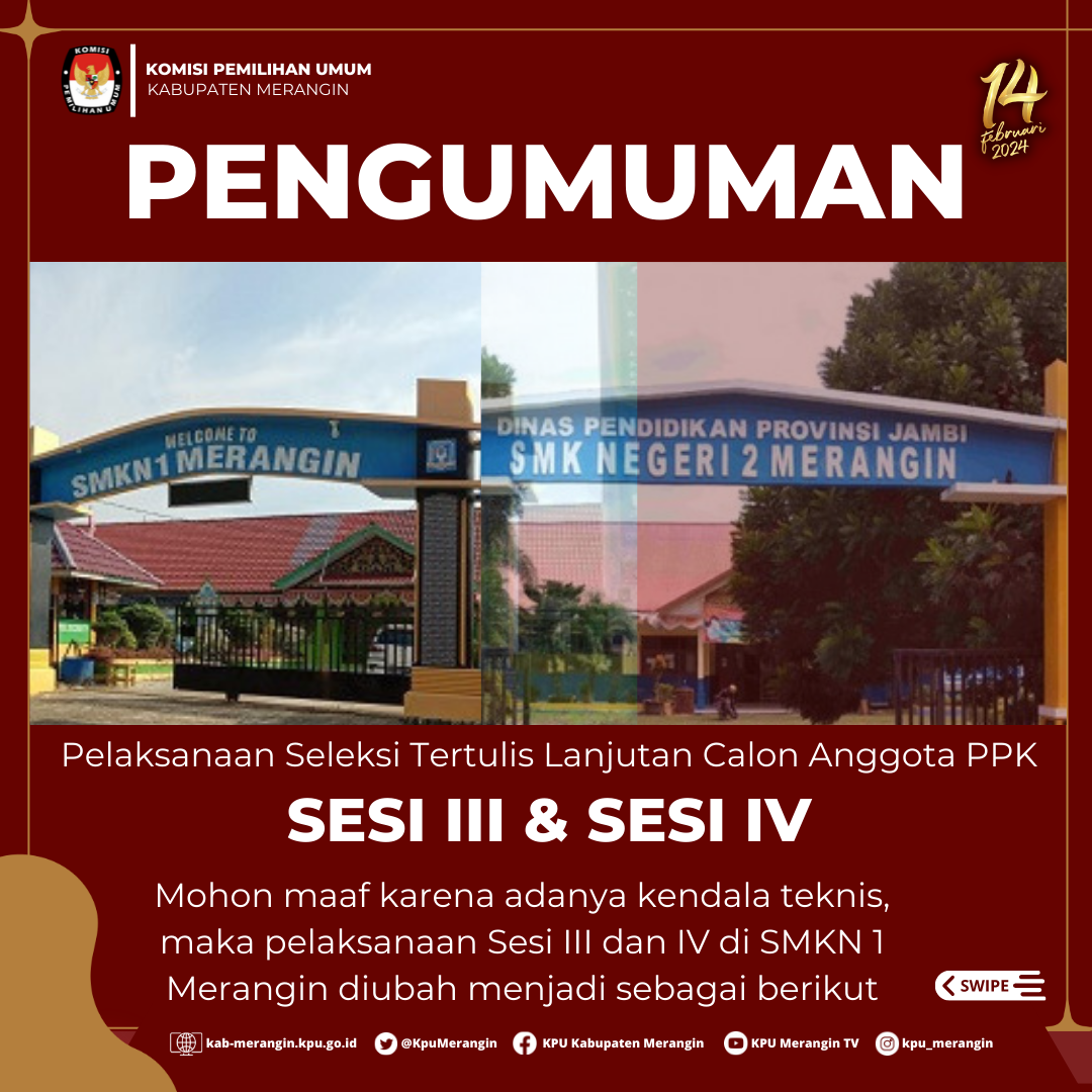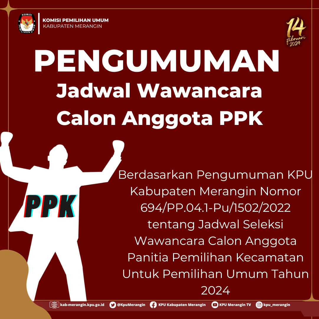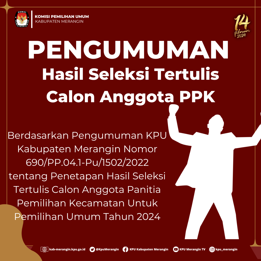 Sehubungan dengan terbitnya Keputusan Komisi Pemilihan Umum Nomor 534 Tahun 2022 tentang Perubahan atas Keputusan Komisi Pemilihan Umum Nomor 476 Tahun 2022 tentang Pedoman Teknis Pembentukan Badan Adhoc Penyelenggara Pemilihan Umum dan Pemilihan Gubernur dan Wakil Gubernur, Bupati dan Wakil Bupati, dan Walikota dan Wakil Walikota yang mengatur mengenai peruahan jadwal pembentukan PPS dengan ini, KPU Kabupaten Merangin menyampaikan hal-hal sebagai berikut: Bahwa berdasarkan Pengumuman KPU Kabupaten Merangin Nomor 716/PP.04.1-Pu/1505/2022 Tanggal 18 Desember 2022 tentang Seleksi Calon Anggota Panitia Pemungutan Suara Untuk Pemilihan Umum Tahun 2024, jadwal pembentukan PPS dalam penerimaan pendaftaran dilaksanakan pada tanggal 18 s.d. 27 Desember 2022; Bahwa berdasarkan Keputusan Komisi Pemilihan Umum Nomor 534 Tahun 2022 tentang Perubahan atas Keputusan Komisi Pemilihan Umum Nomor 476 Tahun 2022 tentang Pedoman Teknis Pembentukan Badan Adhoc Penyelenggara Pemilihan Umum dan Pemilihan Gubernur dan Wakil Gubernur, Bupati dan Wakil Bupati, dan Walikota dan Wakil Walikota, jadwal pembentukan PPS dalam penerimaan pendaftaran dilaksanakan pada tanggal 18 s.d. 30 Desember 2022; Sehubungan dengan hal tersebut, KPU Kabupaten Merangin membuka penerimaan pendaftaran bagi calon anggota PPS sejak tanggal 18 Desember 2022 dan akan berakhir pada tanggal 30 Desember dengan ketentuan sebagai berikut: Persyaratan sebagai Anggota PPS tidak mengalami perubahan berdasarkan Pengumuman KPU Kabupaten Merangin Nomor 716/PP.04.1-Pu/1505/2022 Tanggal 18 Desember 2022 tentang Seleksi Calon Anggota Panitia Pemungutan Suara Untuk Pemilihan Umum Tahun 2024; Dokumen Persyaratan yang telah diterima sebelum terbitnya Keputusan Komisi Pemilihan Umum Nomor 534 Tahun 2022 tentang Perubahan atas Keputusan Komisi Pemilihan Umum Nomor 476 Tahun 2022 tentang Pedoman Teknis Pembentukan Badan Adhoc Penyelenggara Pemilihan Umum dan Pemilihan Gubernur dan Wakil Gubernur, Bupati dan Wakil Bupati, dan Walikota dan Wakil Walikota dapat diterima. Dokumen Persyaratan yang diterima setelah terbitnya Keputusan Komisi Pemilihan Umum Nomor 534 Tahun 2022 tentang Perubahan atas Keputusan Komisi Pemilihan Umum Nomor 476 Tahun 2022 tentang Pedoman Teknis Pembentukan Badan Adhoc Penyelenggara Pemilihan Umum dan Pemilihan Gubernur dan Wakil Gubernur, Bupati dan Wakil Bupati, dan Walikota dan Wakil Walikota menyesuaikan dengan ketentuan jadwal perubahan. Surat Pendaftaran dan kelengkapan dokumen disampaikan kepada KPU Kabupaten Merangin sejak tanggal 18 Desember 2022 sampai dengan tanggal 30 Desember 2022 Pukul 16.00 waktu setempat, melalui: siakba.kpu.go.id dan dokumen persyaratan dalam bentuk hardcopy diserahkan ke KPU Kabupaten Merangin paling lambat 1 (satu) hari sebelum penelitian administrasi berakhir, pada tanggal 1 Januari 2023 dengan menggunakan map snelhecter (map tulang) berwarna hijau; atau Petugas Pendaftaran di Kantor Sekretariat KPU Kabupaten Merangin Alamat : Jln. Raya Bangko-Kerinci, KM.4, Waskita Karya, Kel. Pasar Atas, Kecamatan Bangko, Kabupaten Merangin. Download File Pengumuman